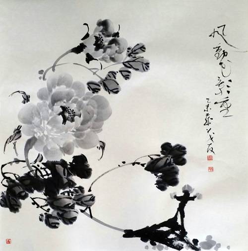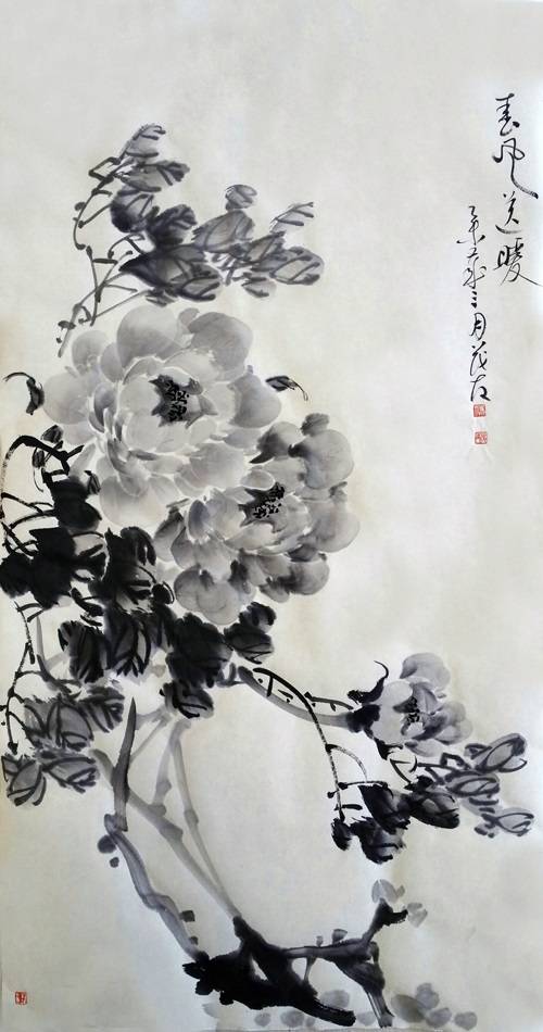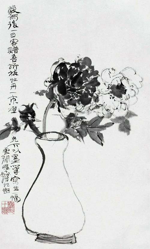 程十发(1921-2007),上海市金山区枫泾镇人。有“上海书画三杰”之誉。名潼,斋名曾用步鲸楼、不教一日闲过斋,后称三釜书屋、修竹远山楼。幼年即接触中国字画,但给他印象之深莫过民间艺术。1941年毕业于上海美术专科学校中国画系。1942年在上海大新公司举办个人画展,1949年后从事美术普及工作,1952年入上海人民美术出版社(华东人民美术出版社)创作员,1956年参加上海画院的筹备工作,并任画师。长期任上海画院院长,是一位成就斐然、中外盛誉的艺术家。程十发的水墨牡丹,笔墨清透,杆枝挺劲有力。牡丹分布富有节奏韵律,长枝处疏短枝处密,交枝处尤其花蕊累累,密而有序,乱中有法,清气袭人,用折枝法,以淡墨加焦墨写牡丹枝干,白描勾出花瓶,淡墨勾花,浓墨点蕊。浓淡相宜,俊朗苍秀,水墨牡丹精气自现,彰显出程十发独特的水墨艺术特色。