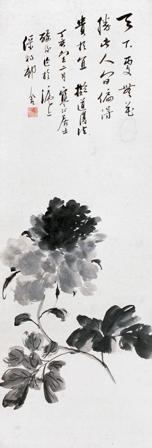 江寒汀(1903—1963),江苏常熟虞山镇人。原名荻、庚元,笔名江鸿,石溪,号寒汀居士。十六岁从同里陶松溪习花鸟画,二十八岁开始卖画为生。中年流寓上海,曾任教于上海美术专科学校。中华人民共和国成立后为上海中国画院画师;为中国美术家协会会员,美协上海分会理事;曾任上海市第二、三届政协委员;传世作品有《百卉册》、《百兽图》等,1960年应周恩来总理邀请为人民大会堂绘制的巨幅《红梅图》,江寒汀擅长花鸟画,尤以描绘各类禽鸟著称于世。他的绘画内师传统,外师造化,广泛地从传统中吸取养料。他曾认真研究历代花鸟画家的技法,上溯宋元诸家,下至明清的陈白阳、徐渭、恽南田、金冬心、八大山人、新罗山人,对双钩填彩、没骨写生,均所擅长。尤对任伯年、虚谷画艺潜心揣摩,系统研究,以致他临摹任伯年、虚谷的作品达到以假乱真的程度,在画坛上有“江虚谷”的美誉。这幅水墨牡丹图在技法上主要延续明清两代逐渐发展起来的写意画风,注重水的运用,以湿笔为主,水中用墨,使墨与水浑然一体;花瓣之间浓淡墨相衬,墨色清雅,浓淡相宜,线条圆润,叶片俯仰具动势,构图具有节奏感。