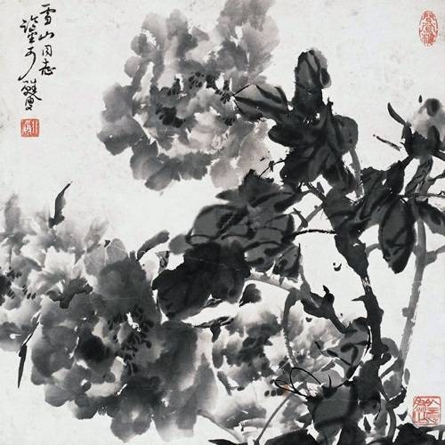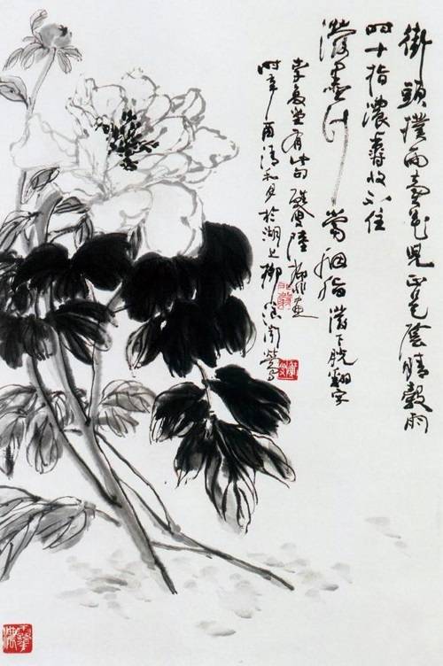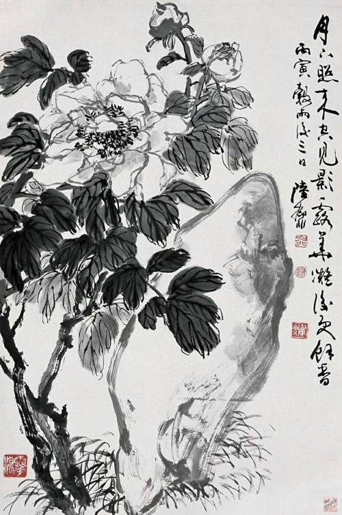 陆抑非(1908-1997),杰出的中国花鸟画大家和卓越的美术教育家。江苏常熟人。名翀,初字一飞。1937年后,改字抑非。花甲后自号非翁。古稀之年沉疴获痊,又号苏叟。曾任中国美术学院教授、研究生导师,西泠书画院副院长,常熟书画院名誉院长,西泠印社顾问,并曾任浙江省第四、第五届政协委员,中国农工民主党浙江省委顾问。陆抑非《墨牡丹》—— 扬州八怪之一李鱓有一首题画牡丹诗:“街头扑面卖花儿,正是阴晴谷雨时。十指浓香收不住,泼翻墨汁当胭脂。”作品正是借李鱓诗的意趣作成。画中牡丹,气象雍容,笔情墨韵,松脱灵透。作者以挥洒自如的画笔,运筹干湿浓淡的水墨,布置出白花墨叶、润含春雨的水墨牡丹图。