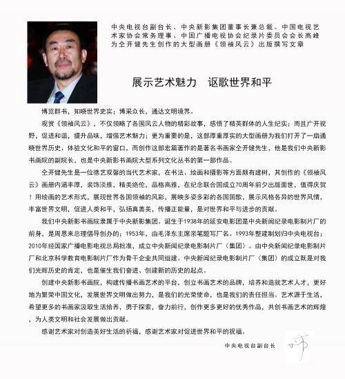 4中央电视台副台长、中央新影集团董事长兼总裁。中国电视艺术家协会常务理事、中国广播电视协会纪录片委员会会长高峰为仝开健先生创作的大型画册《领袖风云》出版撰写文章