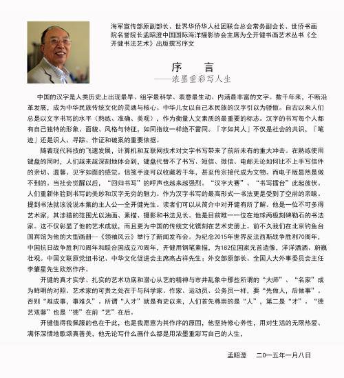5海军宣传部原副部长、世界华侨华人社团联合总会常务副会长、世侨书画院名誉院长孟昭澄中国国际海洋摄影协会主席为仝开健书画艺术丛书《仝开健书法艺术》出版撰写序文