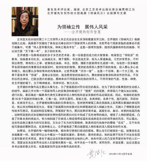 2著名美术评论家、画家北京工艺美术出版社原总编贾德江为仝开健先生创作的大型画册《领袖风云》出版撰写文章