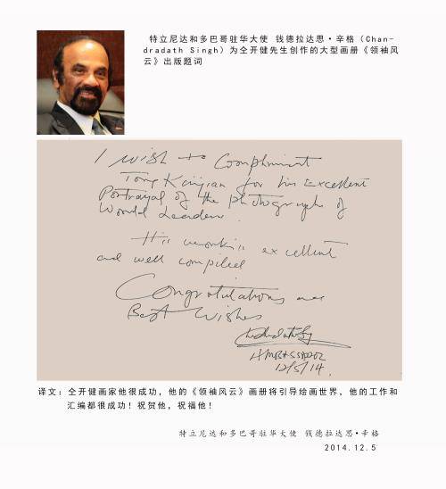 6特立尼达和多巴哥驻华大使 钱德拉达思•辛格(Chandradath Singh)为仝开健先生创作的大型画册《领袖风云》出版题词