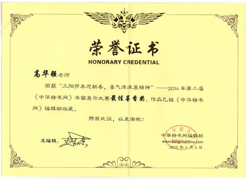 2015.5.6高華強榜書作品荣获2014年第二届《中华榜书网》书画展示大赛最佳墨香奖证书照片