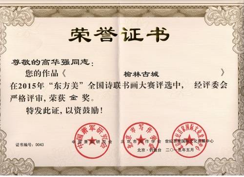 2015.5.8高华强荣获2015年“东方美”全国诗联书画大赛金奖证书照片