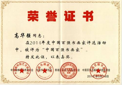 2015.5.18高华强荣获2014年度中国百强书画家荣誉证书照片