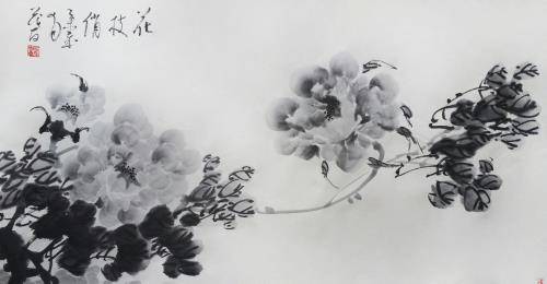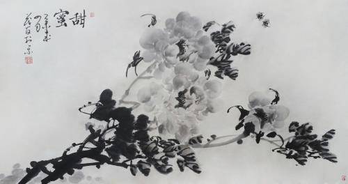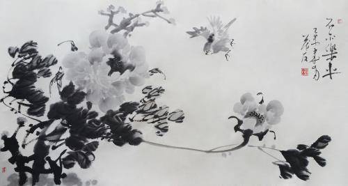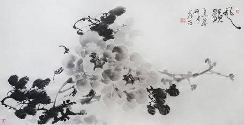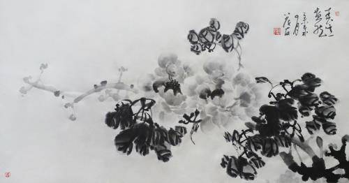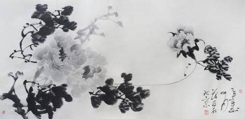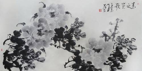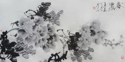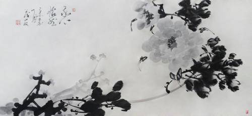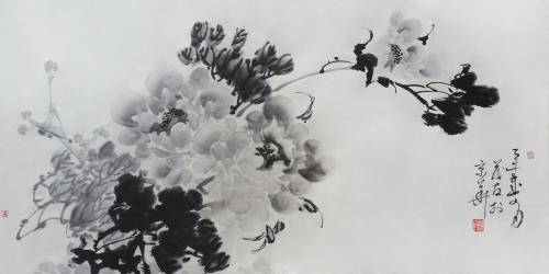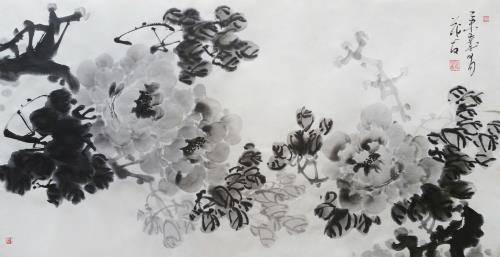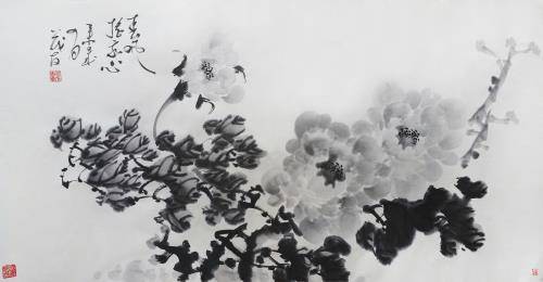 从中国画论中的师法自然,中得心源,再到聊写胸中逸气一论,高度概括了画家从观察到创作的一个过程,并具体落实到创作者的思想与行为中来。就蔡茂友的水墨牡丹创作而言,他首先观察感受大自然的牡丹绽放之美,然后到笔上先调墨色,再到落笔前蘸水或蘸浅色,迅速画去,有时需要笔笔画去,其效果是,每一笔,都呈现由浅到深的形象,并且周围呈现出水纹,下一笔墨色,就压不住前一笔周围就会多层次渲染出水纹墨迹了。这种笔上反复水染的方法,用于描绘牡丹重色花头,点染千瓣花头等等效果极佳。由此可见,由毛笔的墨色和水色的微妙关系而生发出千层笔墨之感,其墨色依然晶莹剔透,有别于传统水墨的表现技法,进而我们欣赏到的是蔡茂友水墨牡丹所呈现出的是墨分千层、清而有神的艺术气质。中国水墨发展不仅是历史的,还是现实的。水墨的状态是兼收并蓄,百花齐放的,这是历史的进步。艺术只有别开生面才能充满活力,所谓“老树春深更护花”,古老艺术一旦焕发了青春,就会产生无可比拟的活力和魅力。蔡茂友继而探本寻源地深入到对水墨牡丹创作系统中,进而提出了具有建设性意义“墨分千层”的水墨创作主论。这种概念,不是一种简单意义上的泛泛的词义解释,而是画家对于水墨创作的深刻领悟与认识之后的精华浓缩,这种解答方式,无疑具有开拓性。