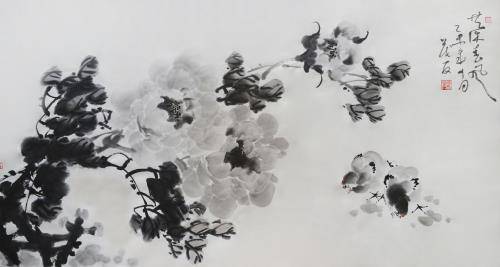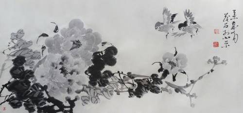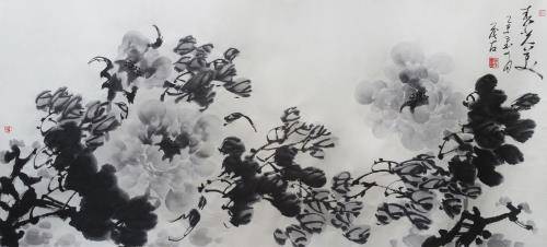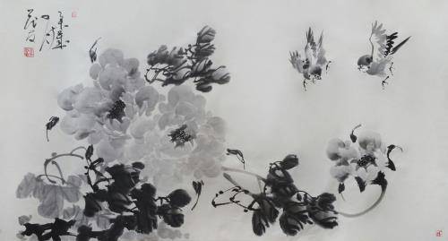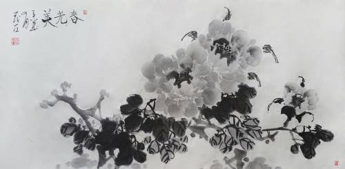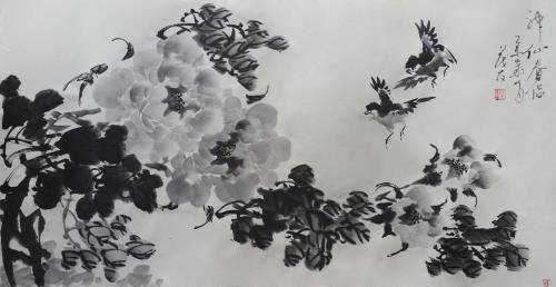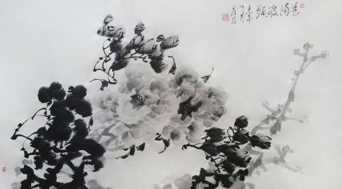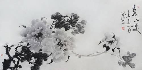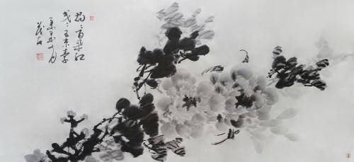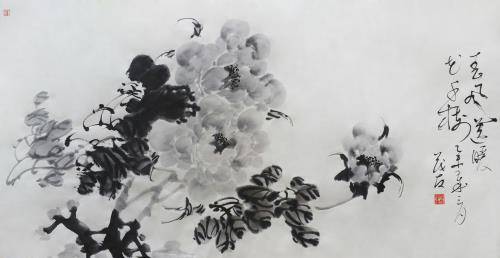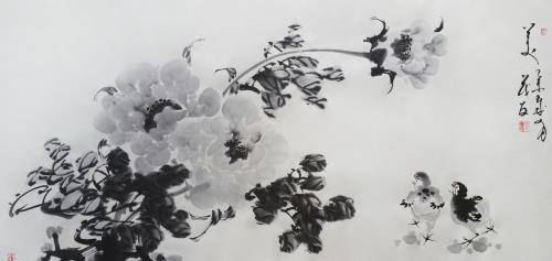 从中国画论中的师法自然,中得心源,再到聊写胸中逸气一论,高度概括了画家从观察到创作的一个过程,并具体落实到创作者的思想与行为中来。就蔡茂友的水墨牡丹创作而言,他首先观察感受大自然的牡丹绽放之美,然后到笔上先调墨色,再到落笔前蘸水或蘸浅色,迅速画去,有时需要笔笔画去,其效果是,每一笔,都呈现由浅到深的形象,并且周围呈现出水纹,下一笔墨色,就压不住前一笔周围就会多层次渲染出水纹墨迹了。这种笔上反复水染的方法,用于描绘牡丹重色花头,点染千瓣花头等等效果极佳。由此可见,由毛笔的墨色和水色的微妙关系而生发出千层笔墨之感,其墨色依然晶莹剔透,有别于传统水墨的表现技法,进而我们欣赏到的是蔡茂友水墨牡丹所呈现出的是墨分千层、清而有神的艺术气质。中国水墨发展不仅是历史的,还是现实的。水墨的状态是兼收并蓄,百花齐放的,这是历史的进步。艺术只有别开生面才能充满活力,所谓“老树春深更护花”,古老艺术一旦焕发了青春,就会产生无可比拟的活力和魅力。蔡茂友继而探本寻源地深入到对水墨牡丹创作系统中,进而提出了具有建设性意义“墨分千层”的水墨创作主论。这种概念,不是一种简单意义上的泛泛的词义解释,而是画家对于水墨创作的深刻领悟与认识之后的精华浓缩,这种解答方式,无疑具有开拓性。
