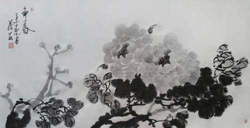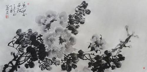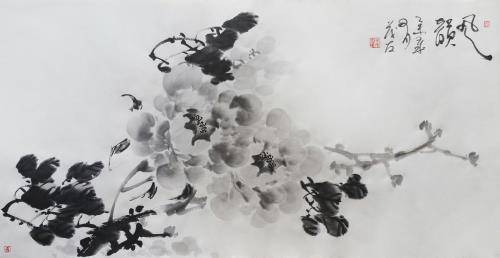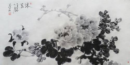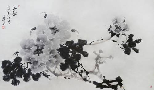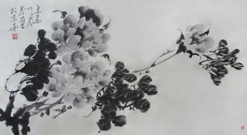 从中国画论中的师法自然,中得心源,再到聊写胸中逸气一论,高度概括了画家从观察到创作的一个过程,并具体落实到创作者的思想与行为中来。就蔡茂友的水墨牡丹创作而言,他首先观察感受大自然的牡丹绽放之美,然后到笔上先调墨色,再到落笔前蘸水或蘸浅色,迅速画去,有时需要笔笔画去,其效果是,每一笔,都呈现由浅到深的形象,并且周围呈现出水纹,下一笔墨色,就压不住前一笔周围就会多层次渲染出水纹墨迹了。这种笔上反复水染的方法,用于描绘牡丹重色花头,点染千瓣花头等等效果极佳。由此可见,由毛笔的墨色和水色的微妙关系而生发出千层笔墨之感,其墨色依然晶莹剔透,有别于传统水墨的表现技法,进而我们欣赏到的是蔡茂友水墨牡丹所呈现出的是墨分千层、清而有神的艺术气质。中国水墨发展不仅是历史的,还是现实的。水墨的状态是兼收并蓄,百花齐放的,这是历史的进步。艺术只有别开生面才能充满活力,所谓“老树春深更护花”,古老艺术一旦焕发了青春,就会产生无可比拟的活力和魅力。蔡茂友继而探本寻源地深入到对水墨牡丹创作系统中,进而提出了具有建设性意义“墨分千层”的水墨创作主论。这种概念,不是一种简单意义上的泛泛的词义解释,而是画家对于水墨创作的深刻领悟与认识之后的精华浓缩,这种解答方式,无疑具有开拓性。