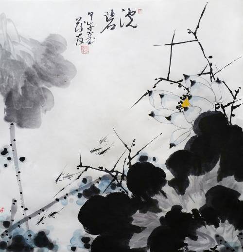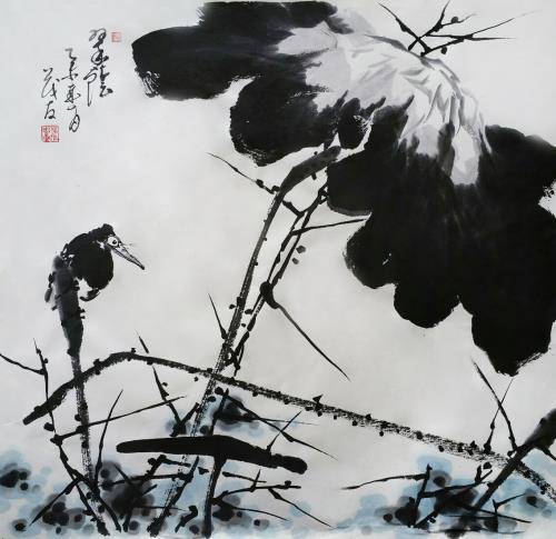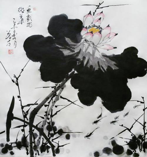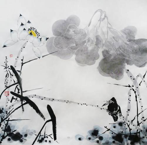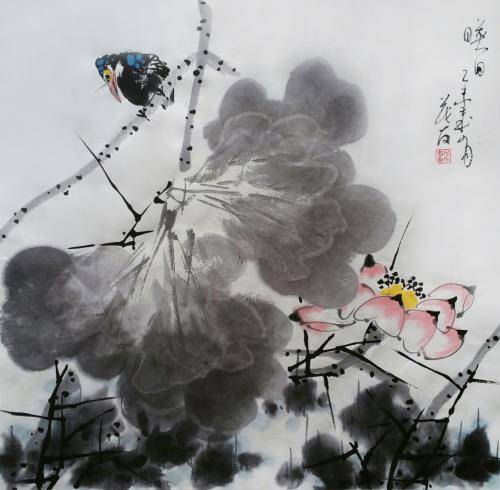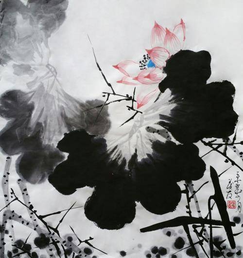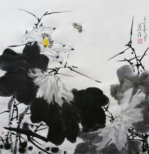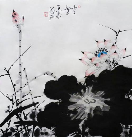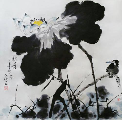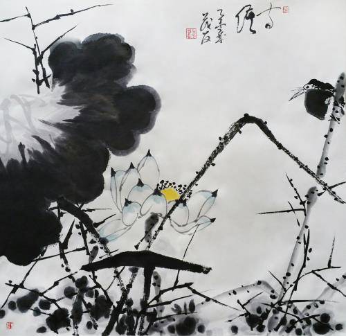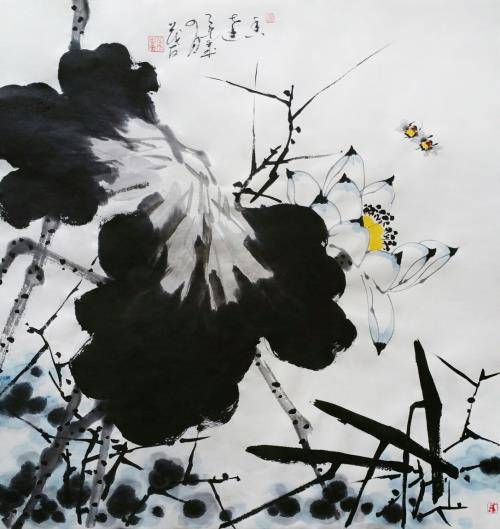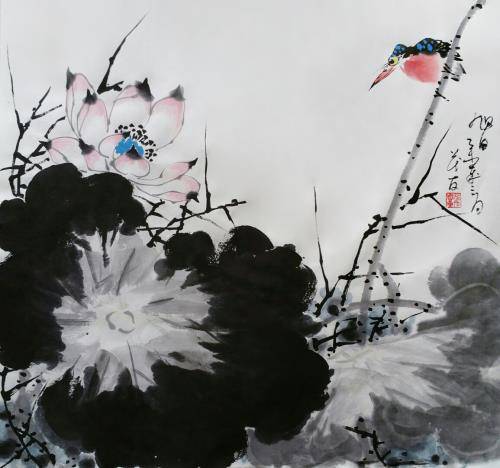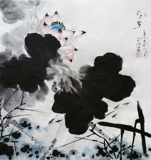 品观蔡茂友的水墨荷花,从其画中找到了书法的气势,又从书法中找到绘画的意象,蔡茂友作画极具书写性,他不尚严谨精细的雕琢,主张放笔直取,以意写形,以势贯气,注重画面整体线面结构的处理与开合关系的把握。从艺术风格呈现的角度来审视,能够把绘画布局与书法章法处理既统一又对立,齐同发展,实属难得。这充分说明了他长期的书法创作对绘画是很有裨益的。著名书画家张大千先生认为“中国画重在笔墨,而画荷是用笔用墨的基本功。”并且还认为画荷与书法有着密切关系。故此,书法功底深厚的蔡茂友先以画荷为入手。在中国的艺术绘画史中,荷花的艺术精品更是丰富多彩。古今描绘荷花景致的作品,大抵分为两种:或以工笔写细韵,或以写意呈精神——前者清冷,后者温情。在蔡茂友水墨荷花画作中,充分地继承了中国水墨画的大写意精神,继而转化为自我意境,以热情却不事张扬的色调,描绘了荷韵当风大地的场景:风和日丽,清香浮游,青鸟翔来,从这一系列水墨荷花系列作品中所呈现出荷塘天地交接之处布满看来,点亮了荷枝杈之间——水墨叶蔓与荷花完美的融合,体现出艺术家将具象与抽象、再现与体现、写实与浪漫高度合一的功力。画面整体简括洗练,由而显出了出污泥而不染之品格恒为世人称颂的精神和整个画面意境上的宁静,这种“理想”的形象是在“写实”的前提下经过凝炼而成的,是与精神的真实接近的艺术形象,也是蔡茂友在艺术情趣上走向个人内心、走向优雅端庄的反应,突出体现了蔡茂友在水墨画上的艺术追求。尤其值得称道的是,艺术家融合了微妙的墨法变革、颇具气势的构图以及苍劲的笔法,在《醉荷》《冷翠》《回眸一笑》《映日》等作品充分显现出蔡茂友水墨荷花独特的格调。