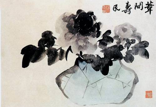边寿民(1684-1752)清代著名花鸟画画家。初名维祺,字颐公,又字渐僧、墨仙,号苇间居士,山阳人(今淮安区),晚年又号苇间老民、绰翁、绰绰老人,江苏淮安秀才。善画花鸟、蔬果和山水,尤以画芦雁驰名江淮,有"边芦雁"之称。其泼墨芦雁,苍浑生动,朴古奇逸,极尽飞鸣、食宿、游泳之态。泼墨中微带淡赭,大笔挥洒,浑厚中饶有风骨。又善以淡墨干皴擦小品,更为佳妙。因他画芦雁,称其所居名"苇间书屋"。他又工诗词、精中国书法。和郑板桥、金农等人齐名。边寿民的水墨牡丹,用笔轻松随意,墨色朴素淡雅,或者喜欢添瓶中牡丹不加旁衬,鲜明突出。着笔虽不多,牡丹花开、半放之态却活现于纸。画面墨气淋漓,情趣盎然。