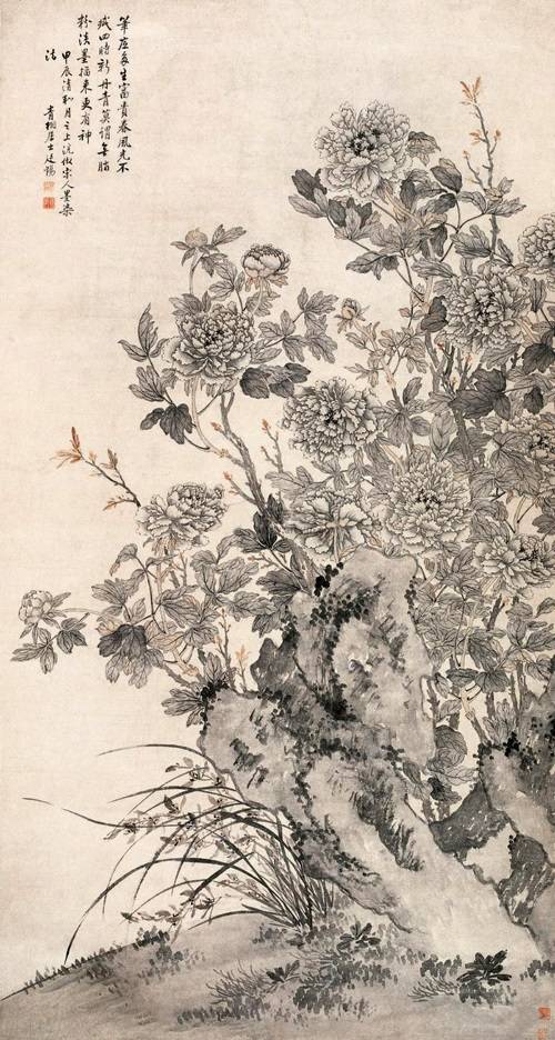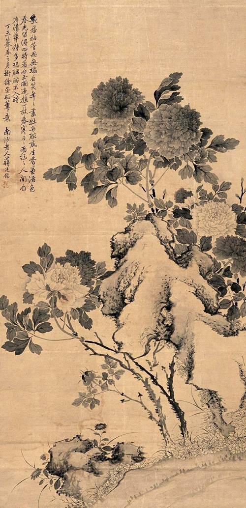 蒋廷锡,清朝康熙、雍正年间著名的花鸟画家,清初恽寿平在花鸟画坛起衰之后,蒋廷锡学其没骨画技,变其纤丽之风,开创了根植江南、倾动京城的“蒋派”花鸟画。由于水墨工具的灵活容易发挥,不拘泥于工致,蒋廷锡笔下的花卉虽墨色简淡,却生态栩栩。但对于水墨的灵活,他仅取其生气,不取其疏狂,并不借笔墨随意发挥,而是相当克制的。欣赏其画面上枝干和层层花瓣皆以勾勒之法画出,略作晕染,杂叶以浓淡墨写之,用笔灵活浑融,不拘泥于工致。其水墨牡丹画中勾描尚存南宋之笔意,但不用焦墨,已与南宋的细腻勾勒相去甚远。正如他的墨牡丹册提出:“写牡丹当于整齐中求生动,若笔太松放,便非牡丹品格。”蒋廷锡的水墨牡丹洗尽铅华,栩栩如生,颇有徐熙野逸之风,与其供御之作迥异其趣。
