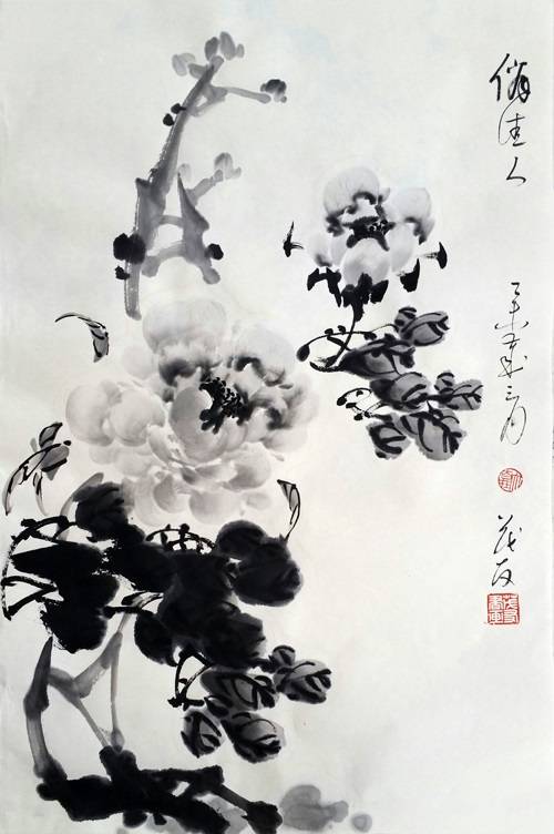 居巢的作品在当时就获得很高的评价,“尺幅兼金,人争购之”,人们将他与另一著名画家黎简相提并论,惜其早逝,其影响力却通过从弟居廉持续影响岭南画坛半个多世纪。居廉写水墨牡丹并配以湖石,画面布置稳重,呈曲线向上变化。牡丹花瓣润泽,叶片描画活泼,以淡墨晕染,皴笔奇石,尽显秀逸坚实之感。居廉的水墨牡丹于精密写实之外,又彰显水墨写意牡丹清新典丽的特质,以逸笔写意,或奇或正、或率或工、独具特色。