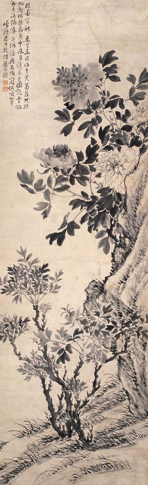 张敔(1734—1803)字虎人,又字茝园,一字芷园,亦作芷沅,号雪鸿,又号木者(一作木香),晚号止止道人,先世安徽桐城人,迁江宁(今南京),籍山东历城。乾隆二十七年(1762)举人,官湖北房县知县。以冒籍事去职,遂遍海内。天资高迈,为人疏放不羁。工诗。卒年七十。张敔能书、工诗、善画山水、人物、花卉 、禽虫,白描设色,无不工妙,随意挥洒,笔气豪纵。惜显筋露骨,未脱金陵派习气。其写真尤神肖,兴到即写,往往不携图章,竟率笔作印,亦精妙。兼擅四体及飞白书。至若以左手或竹箸、指头书、画,无不造极。张敔所写水墨牡丹运笔工致,属小写意。画中多朵全放的牡丹花被枝叶托着,枝干浓墨勾皴,再以水墨罩染,工整秀逸,境界清幽,表现作者精湛的水墨技艺。