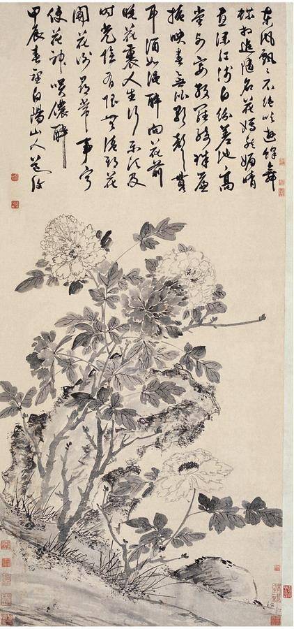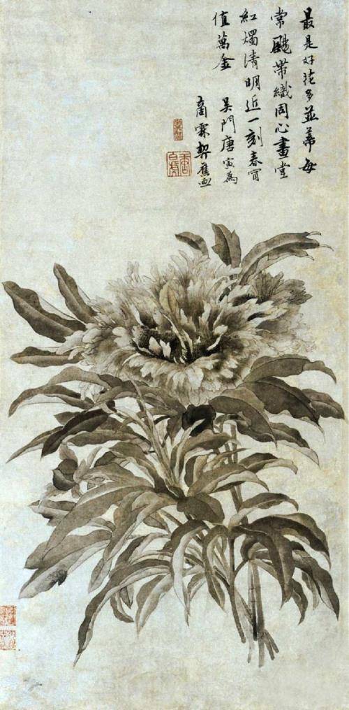 他们对于苏州地区以及中国水墨牡丹画发展有着不可磨灭的贡献,特别是唐伯虎, 唐伯虎,名唐寅,吴县(今江苏苏州)人。明朝著名的画家、诗人。唐伯虎玩世不恭而又才华横溢,诗文擅名,与祝允明、文徵明、徐祯卿并称“吴中四才子”(即民间所说“江南四大才子”),画名更著,与沈周、文徵明、仇英并称“吴门四家”,又称为“明四家”。唐伯虎画水墨牡丹,花叶偃仰,墨分五色,得形得神。因落笔精准,无拖沓涂抹之弊,故墨彩湛然,淡而弥厚。旁题书词旨婉约,书法清丽,益增书卷秀色,足称妙品。再者他作水墨牡丹构图创意在“套路”中往往又能独出心裁,其画作的“雅”与“工”恰到好处,由此创立了文人趣味与水墨牡丹技艺的高度和谐。