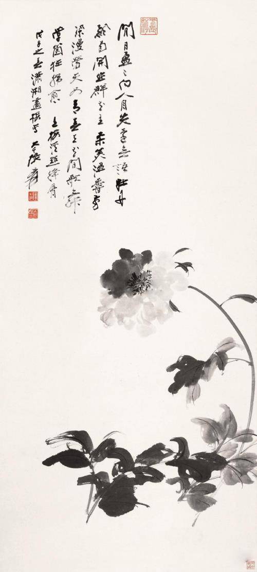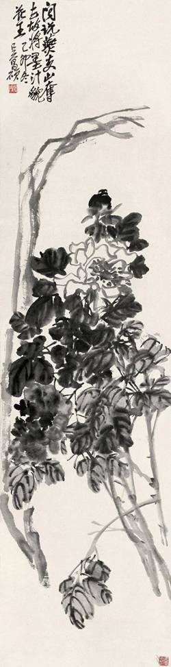 论之晚清大家吴昌硕,也受到吴门画派传统的熏陶,曾在苏州居住多年。吴昌硕的写意水墨牡丹,一是重气尚势,以浑厚豪放为宗,二是“直从书法演画法”,以书入画,以印入画,以金石气入画,如写如拓,高古凝重。比之于白阳,更显磅礴;比之于徐渭,更厚重苍茫;比之于八大山人,显得烂漫;比之于复堂,更沉雄;比之于赵之谦,更老辣。他的水墨牡丹常伴奇石,牡丹以单纯朴厚的笔法,大写意出花卉与奇石;水墨运用酣畅自如,丰富的灰色层次使画面的张力得以增强,苍茫浑厚之气蓬勃而出。