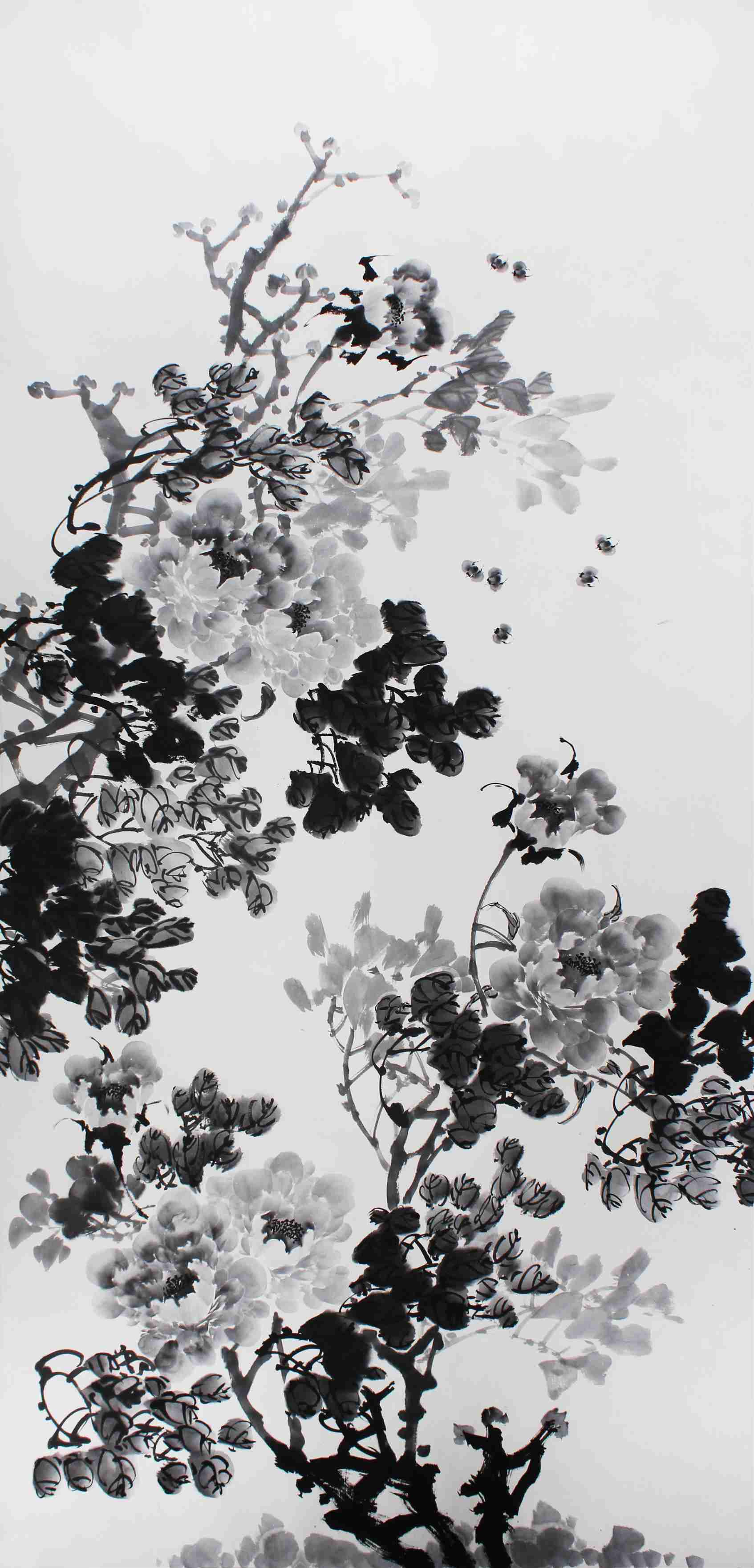 就水墨牡丹创作而言,画家首先笔上先调墨色,再到落笔前蘸水或蘸浅色,迅速画去,有时需要笔笔画去,其效果是,每一笔,都呈现由浅到深的形象,并且周围呈现出水纹,下一笔墨色,就压不住前一笔周围就会多层次渲染出水纹墨迹了。这种笔上反复水染的方法,用于描绘牡丹重色花头,点染千瓣花头等等效果很好。再有,用一根沾过墨的毛笔,一直在画,尽管更换了很多次水,总感觉“笔上的墨洗不清”。多次画在宣纸上依然有笔有墨,反复晕染越多,层次变化就越发丰富。由此可见,由毛笔的墨色和水色的微妙关系而生发出千层笔墨之感,其墨色依然晶莹剔透,有别于传统水墨的表现技法。由此“笔上的墨洗不清”自然生发出来的墨分千层,其来源于水墨的无定法游离的一种越界,水色清透,清而有神,这虽不完全关乎墨的本质,但墨的本质却和它有直接的关系。墨色中的清而有神,是由其它深浅不同的墨色衬托出来的。换句话说,也就是在一幅画的空白部分,画出某种事物的清淡墨影,而这清淡墨影,在面面上却具有极其重要的表现价值,它反映着某一时间空间的特点,使观者深入画里,埋藏无限境生。