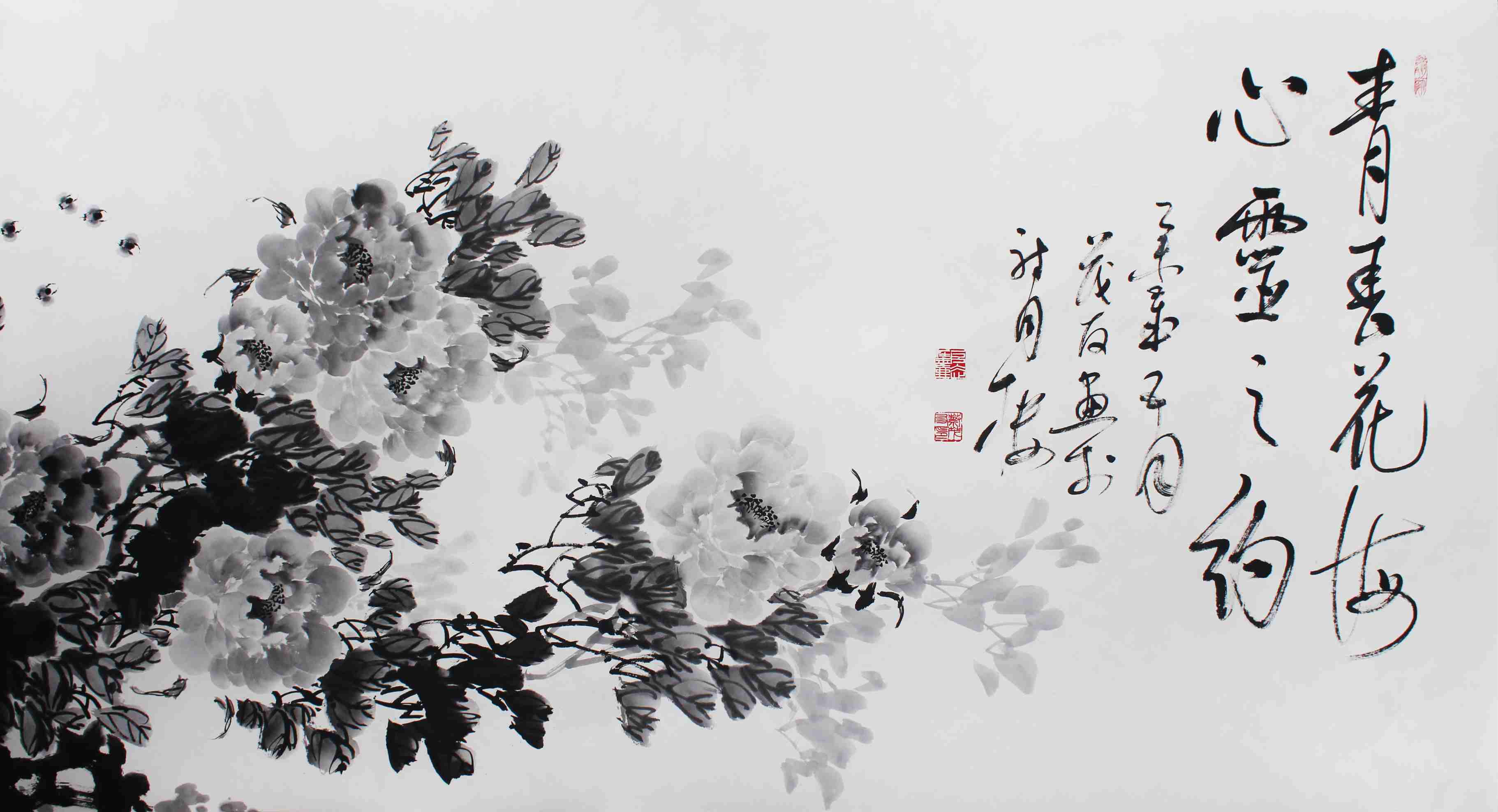 诗人杜甫诗曰:“生气淋漓幛犹湿。”表达的就是这层意思。事实上,“幛”(画幅)早就干了,可是一幅经典的水墨画,多年后。看上去就好像还是有水淋淋的感觉,这就是创作中用墨产生的效果。也就是水产生的效果,画家借墨色把水的生命永远留在了画面上。蔡茂友水墨牡丹“墨分千层”之法,在写意花鸟画创新之路中树立了一个很好的典范,从他的作品中就可以看出,充分发挥和利用水这一笔墨的介质作用,较大范围内,更大程度上以水与墨的施用来带动多种技艺的综合能力,拓展中国写意花鸟画的表现空间,丰富写意花鸟画的视觉审美效应。