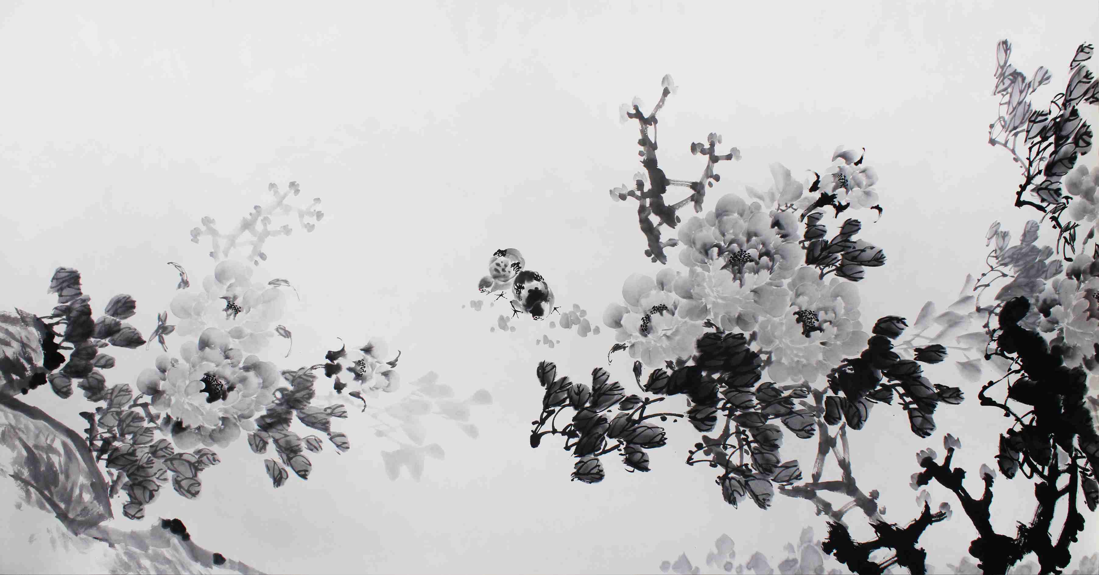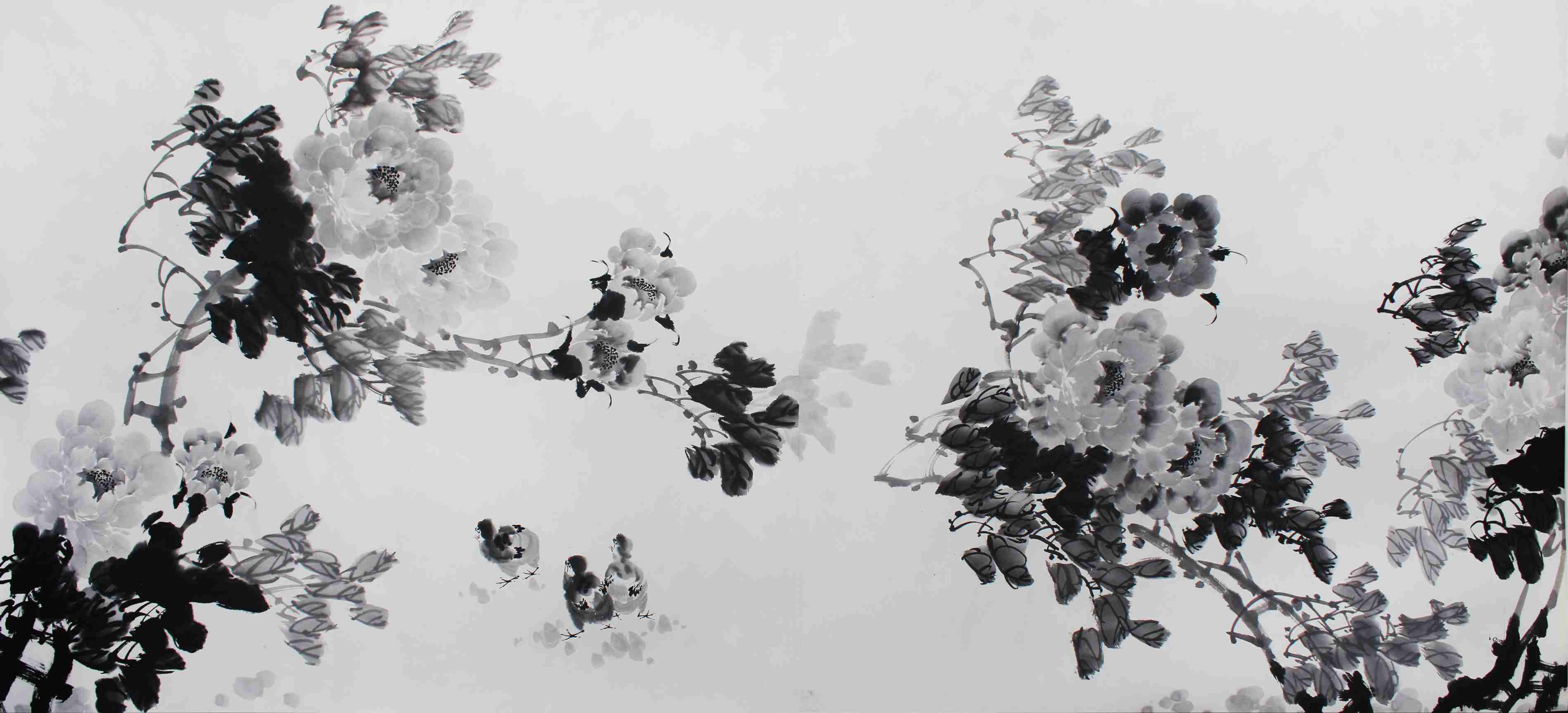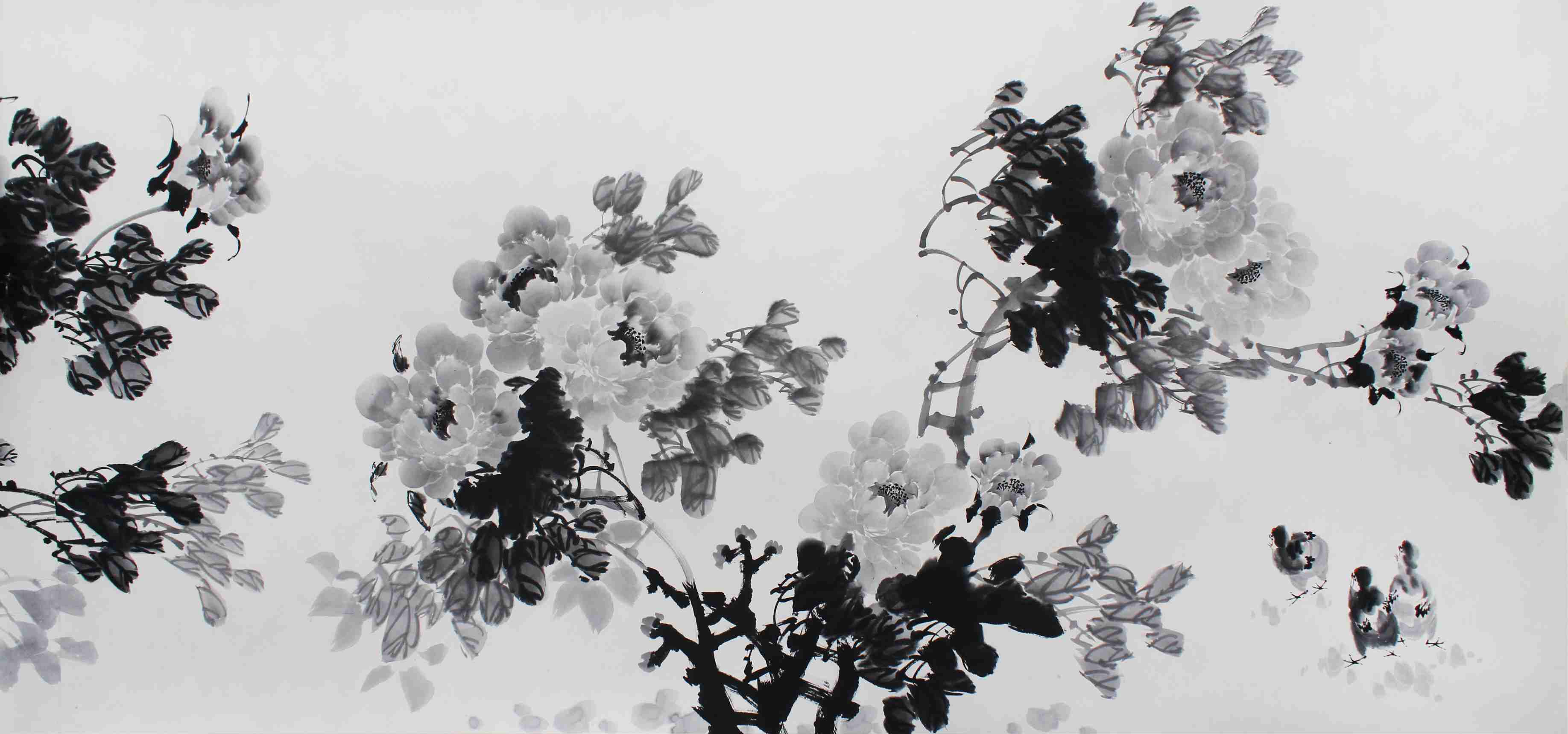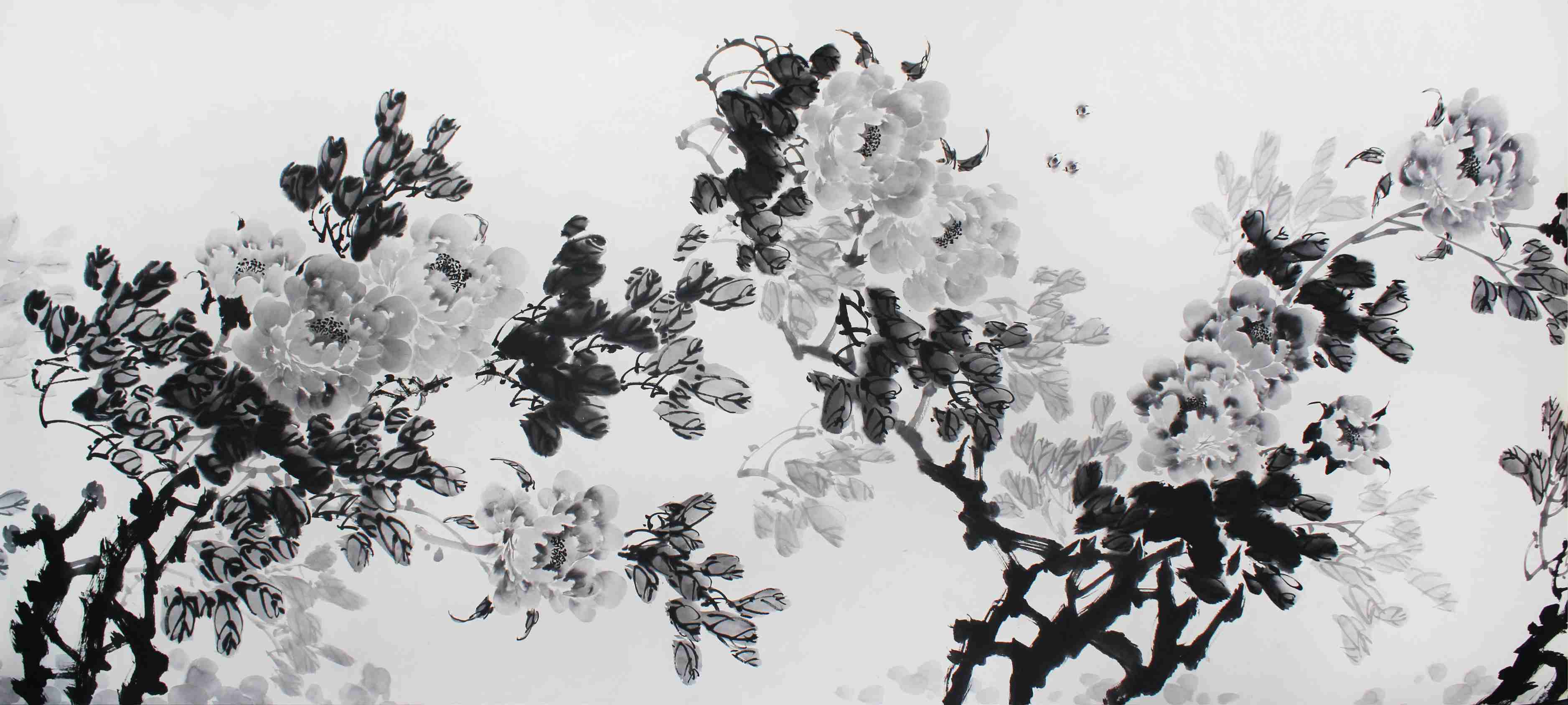 我们欣赏蔡茂友水墨牡丹长卷《青春花海 心灵之约》,充分展现了“墨分千层”的画面效果,他采用先着墨色后勾皴枝杆,再画出花头及枝叶,然后进行泼、点清水,使画面满溢清新氤氲之气。为了表现花朵晶莹剔透,他用淡墨或笔洗水,衬托花朵,此时若再在此淡墨水上,进行水破之,会使画的主题更突出,而且衬托部分与花更近,画面已较为清丽剔透。历史上善于用泼墨、泼色的画家,无不善用泼水。泼水可以有效的弥补泼墨的不足。在构图上,蔡茂友不是立足于某个固定的空间或时间,而是以灵活的方式,打破时空的限制,把处于不同时空中的物象,依照画家的主观感受和艺术创作的法则,重新布置,构造出一种画家心目中的水墨牡丹境界。于是,把一片花海流动延伸展现于同一幅画中。因此,在透视上它也不拘于焦点透视,而是采用多点或散点透视法,以上下或左右、前后移动的方式,观物取景,经营构图,具有极大的自由度和灵活性。充分地展现中国水墨牡丹长卷独特的艺术魅力。