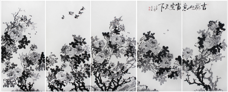 蔡茂友水墨牡丹《吉祥如意 富贵天下》2.8米X1.09米X5