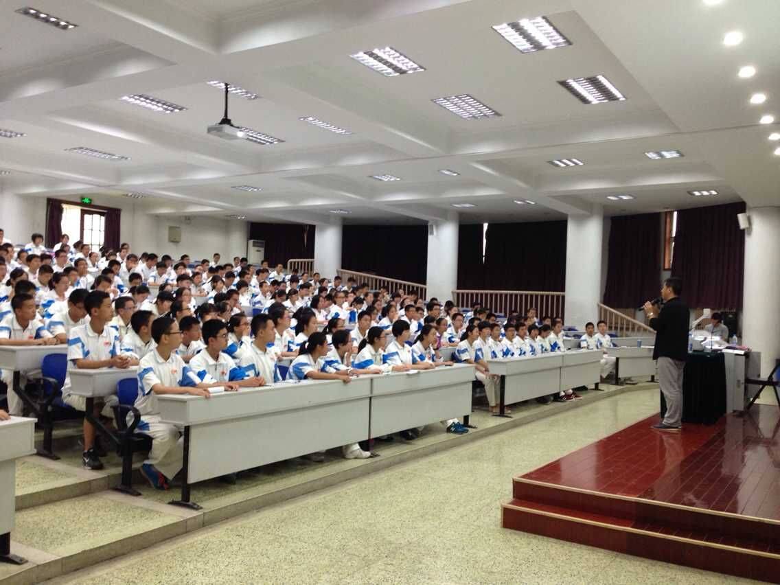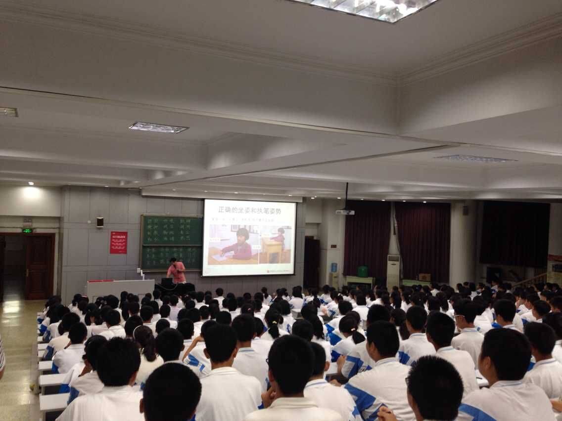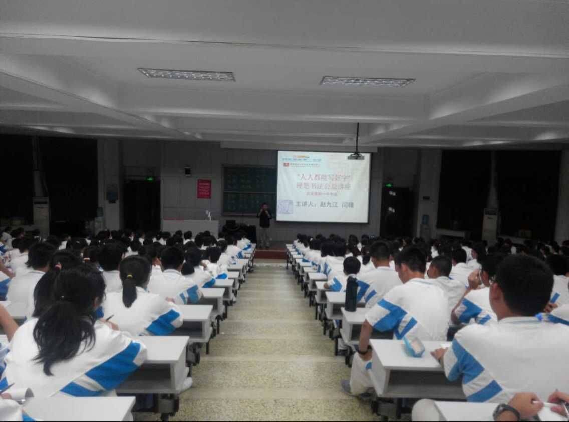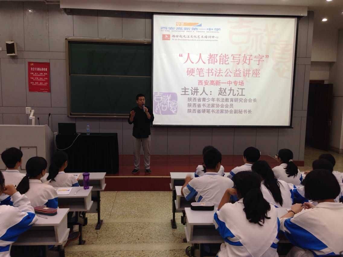 为了落实省教育厅、省书协“书法名家进校园”活动,响应中国书法教育联盟“全国书法名师公益讲座进校园倡议书”, 2015年9月8日、9日下午,受校方邀请,“人人都能写好字”赵九江硬笔书法公益讲座走进全国重点中学----高新一中高中部。