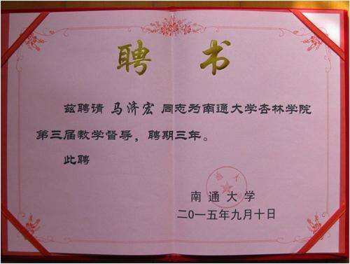 南通大学杏林学院第三届教学督导聘任书-聘期3年