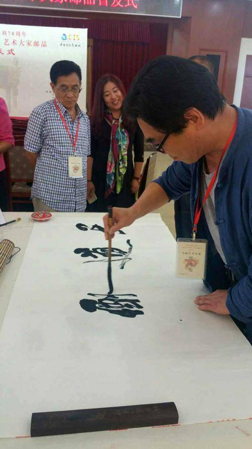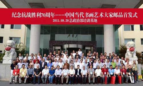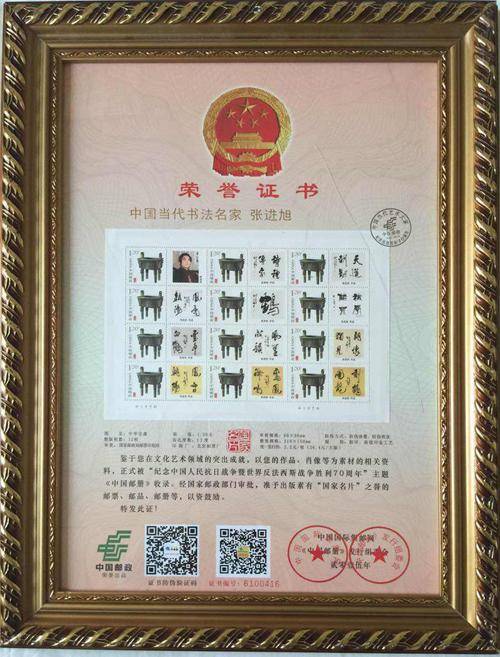 河南伊川实力派书法家、中国当代书法名家一一张进旭,在总政治部纪念抗战胜利70周年一一当代艺术名家主题邮品首发式频奖证书活动现场。