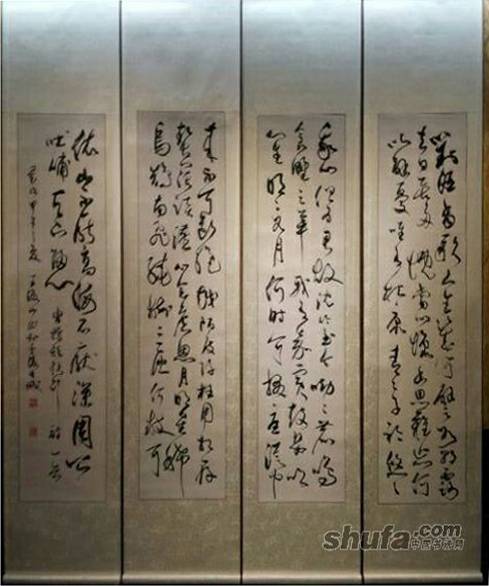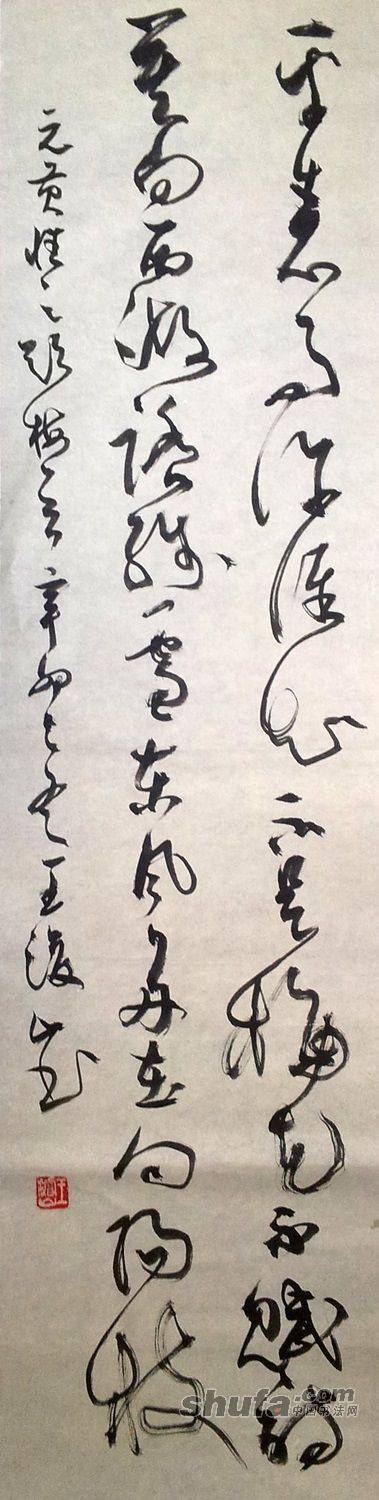 四是回环盘纡、变而能化。这一点也颇能见出作者的才情、功力和匠心。细察王浚山书法作品,通篇笔调一致,墨相和谐,运笔如风的飘逸中时显沉郁,狂奔飞驰的缠绕中不忘留驻,不管笔画长短、曲直、断续、以及结字如何变化,浚山先生均用他那支激情而又理性之笔处理得盘纡而婉畅、绵韧而遒健,充分显示出作者驾驭毛笔的超凡能力。