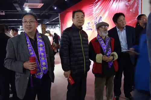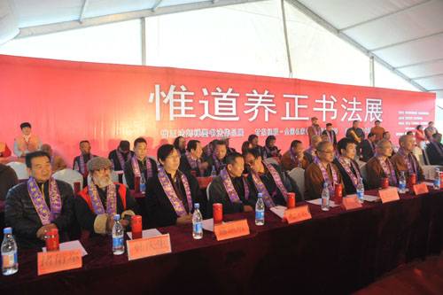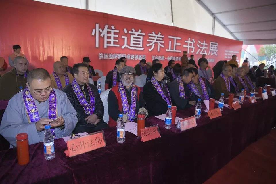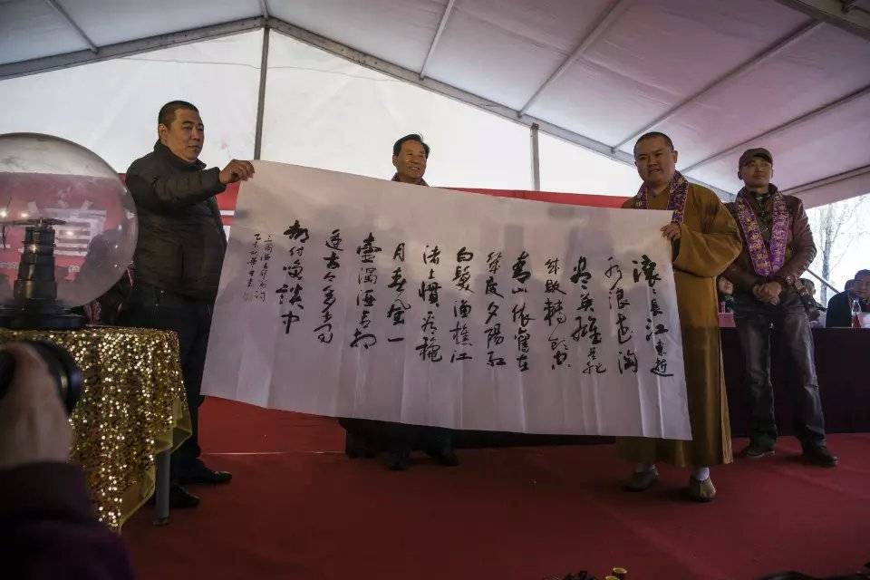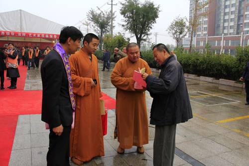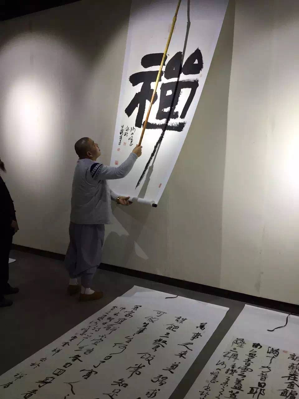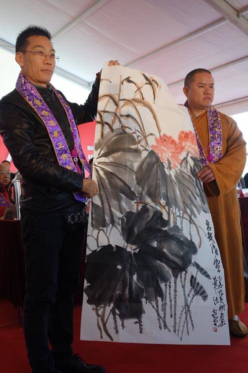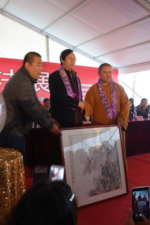 在开幕式上有关领导、艺术家向惟正法师赠送祝贺作品