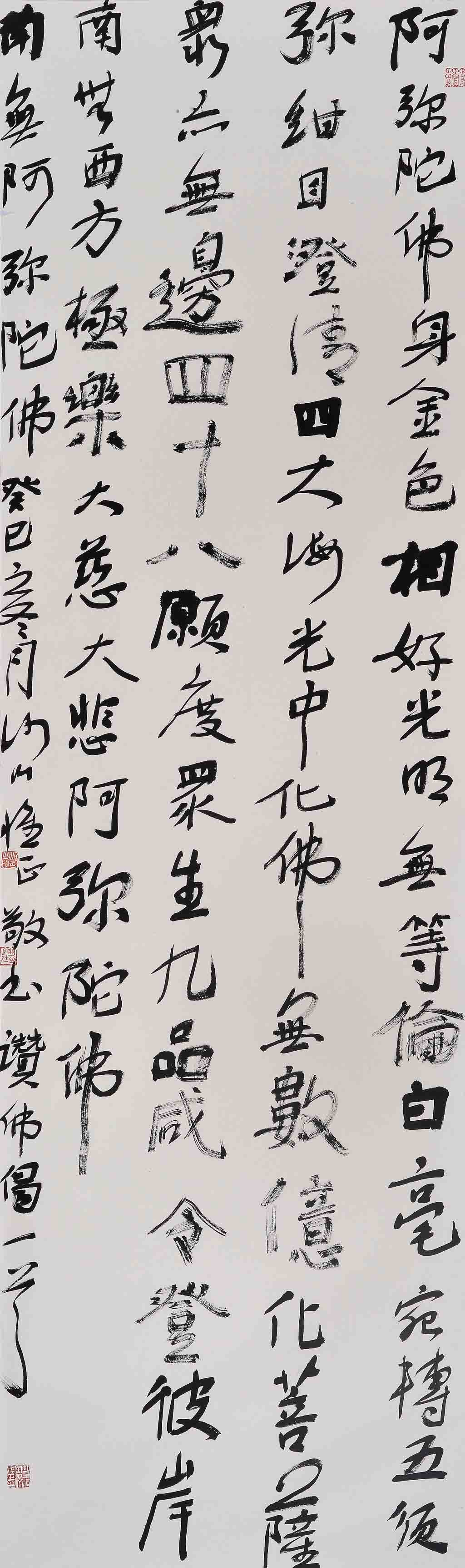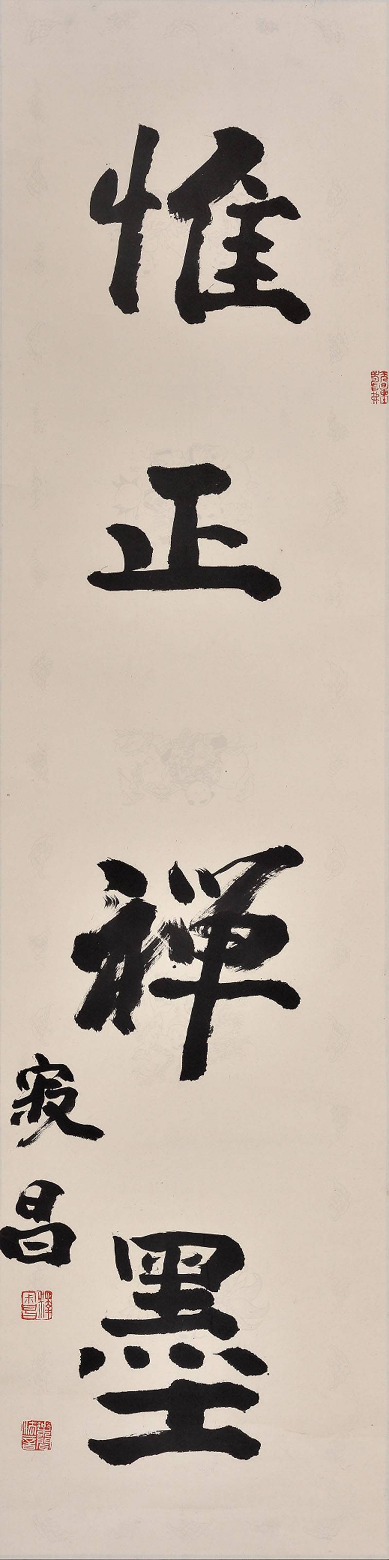 惟正和尚书法多取法于颜真卿,兼及秦汉篆隶、六朝碑版,参以明清调的高堂大轴,对于晚清以来的碑帖兼容颇多实践。惟正和尚严持戒律,崇信净土法门,他的书法却是气局宏大,不拘一格,酣畅处如法雨方滋,猛烈处如金刚怒目,威而不猛,雄而不霸。从专业的角度来讲,惟正和尚首先是一位很有造诣的书法家,如果推及释门大德,他是兼及智永怀素的——修行威严,艺术洒脱。通过观照他的作品,可以想见其对于书法用功之勤勉,才情之超迈。