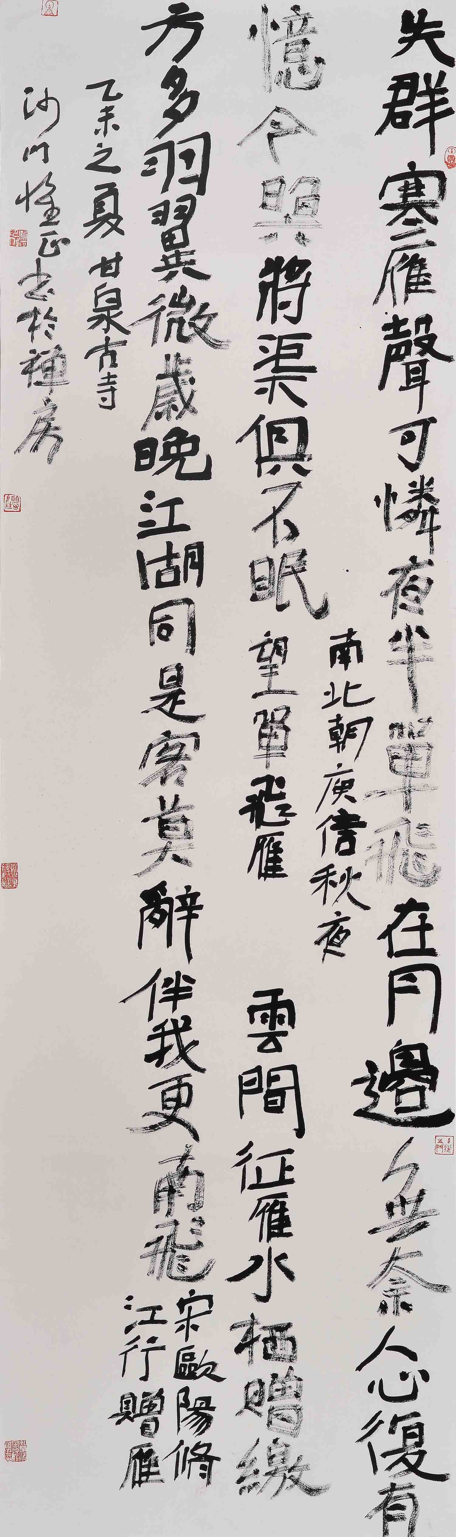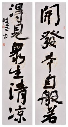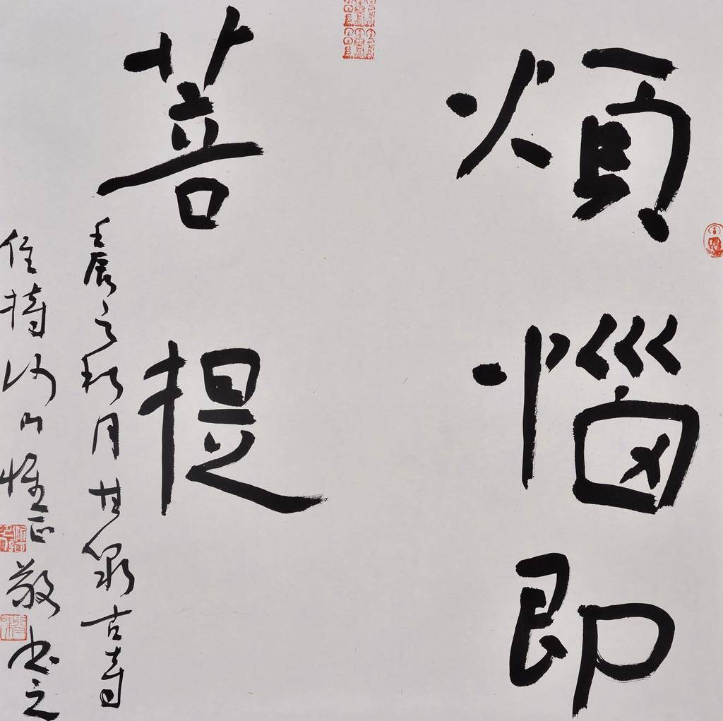 法师四体兼备,然尤以行书见长,其行书不拘古法,多创新意。正乃行笔而不停,著纸而不刻,轻转而重按,如水流云行,无少间断,永存乎生意。此如南宋姜夔所谓“以笔老为贵,少有误失,亦可晖映。所贵浓纤间出,血脉相连,筋骨老健,风神洒落,姿态俱备。”然吾观法师作品,似有天生瘦金之体,又杂糅郑燮六分半书于其间,此所谓大道无形,君子不器。或抑禅家随拈一物皆同法性、平等不二、绝待圆融使然乎?龙文虎脊皆君驭,才力应难跨数公;未及前贤更勿疑,递相祖述复先谁?其实,书画同源,皆须“写到生时是熟时”。我除钦佩法师的定力、忍力与慧力之外,更期其书法禅道同入悟境,渐臻妙域,炉火纯青,迥出群伦。