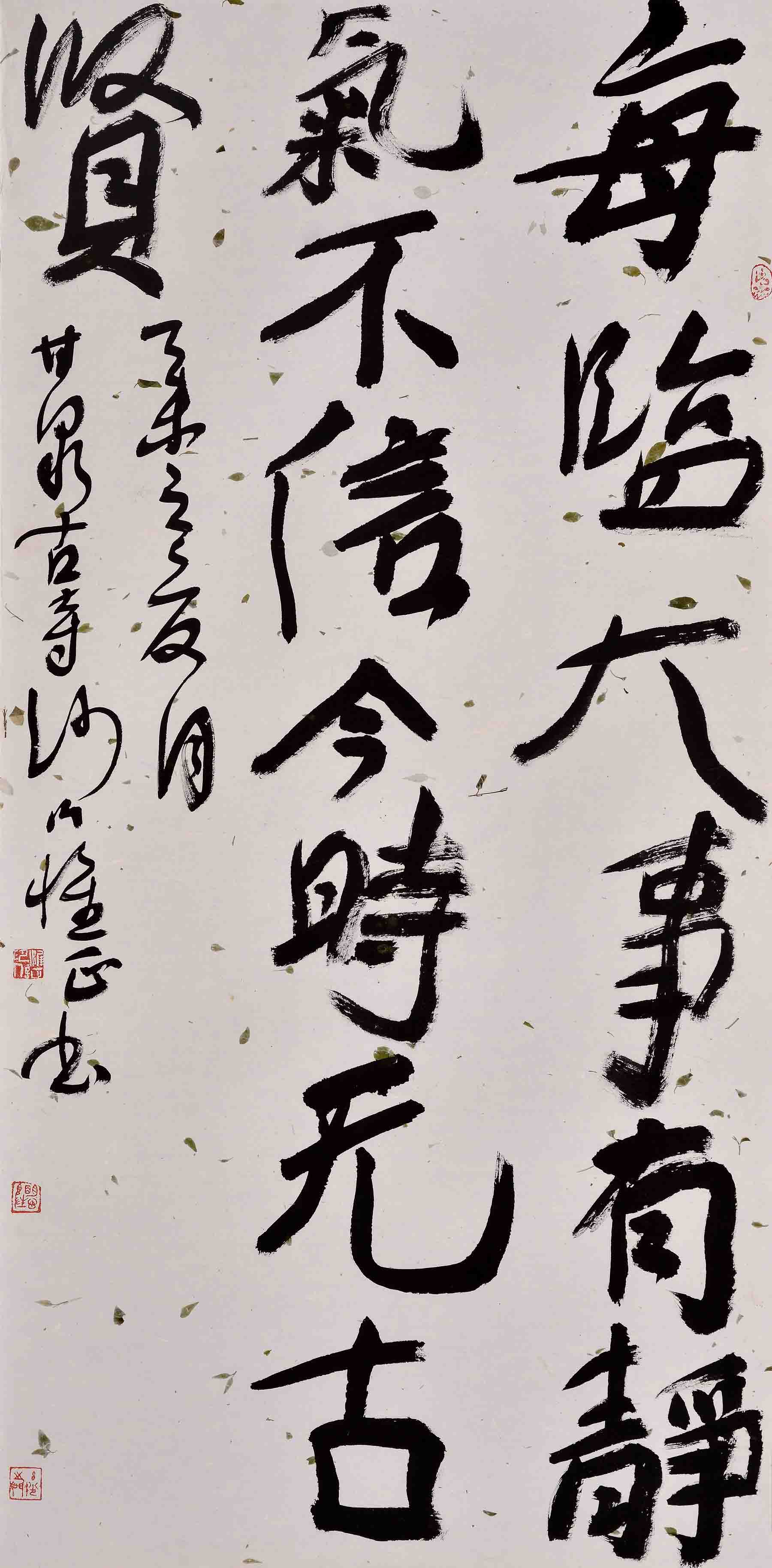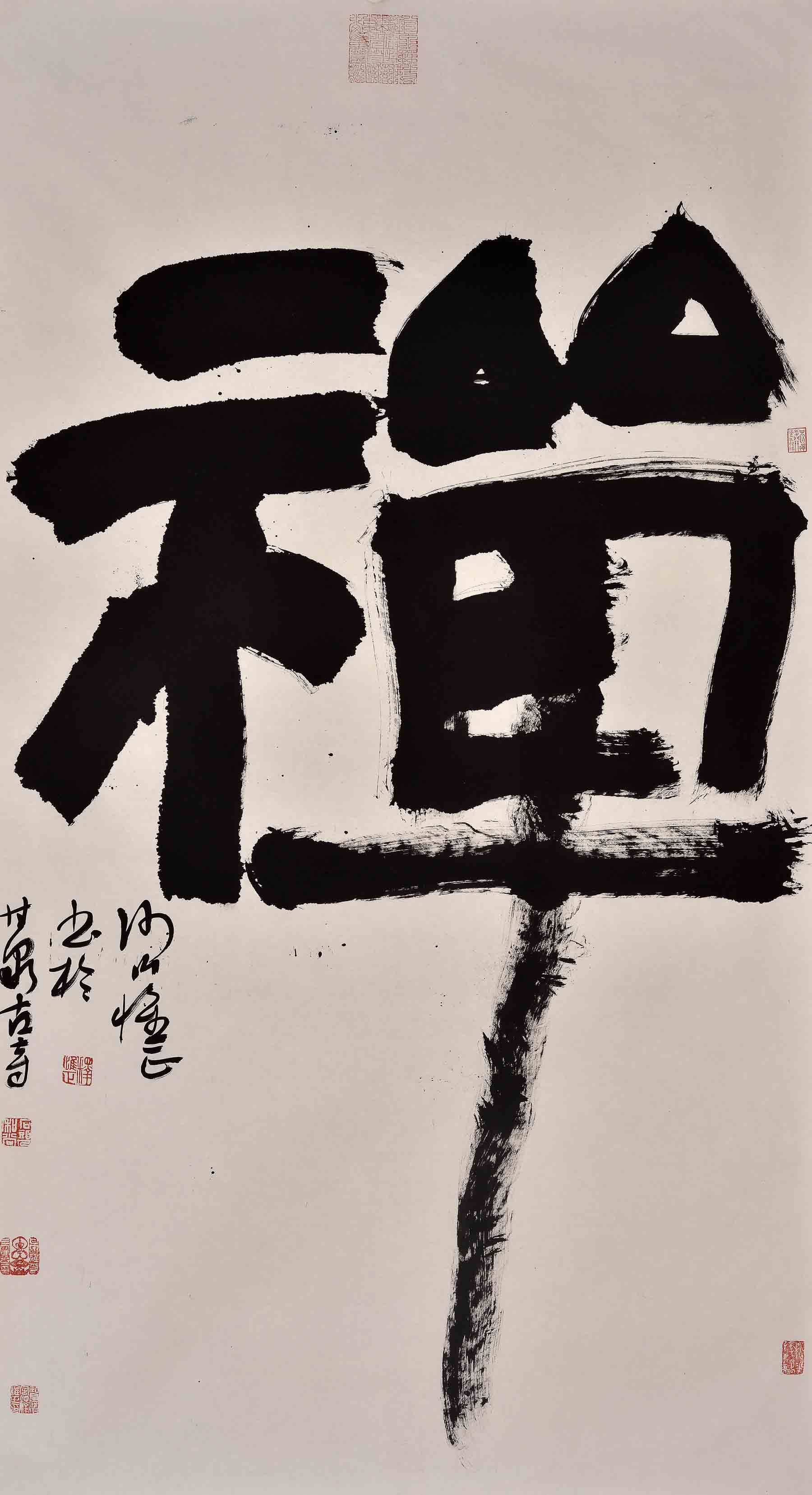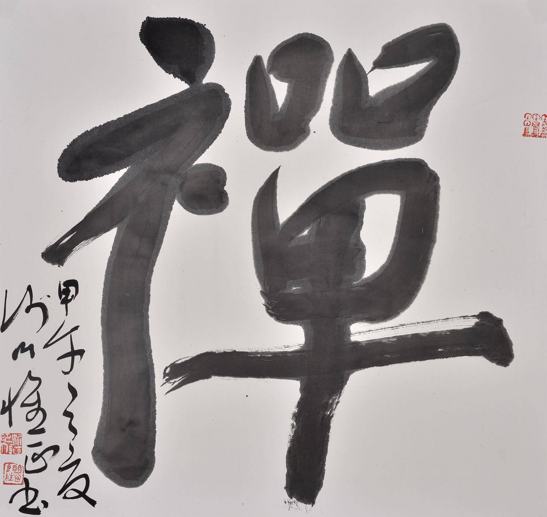 禅学其实是一种很高级的人学。它可以使人开悟聪慧,清明心安,在世间不即不离。这种不即不离如果用哲学表达,就是不出不入。如果用在书法上就是惜墨如金,以一当十,以少胜多。相信众生皆有悟性,点到为止,留下大量的虚白给观赏者。惟正法师就是这样用笔用墨的。禅法帮了他的大忙。他的成长是禅在心里面的生长。
