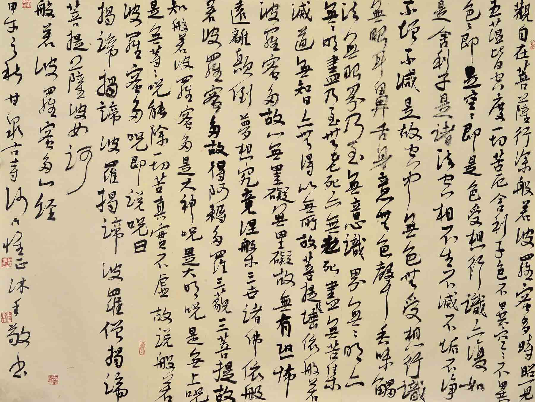 师从闻思修,入三摩地,由文字般若,达观照般若,以书画为载体,借世法以弘佛,其画如写字,其书兼画工,行笔简澹,意向超俗,收放于有意无意之中,恰如羚羊挂角,无迹可求。今草古隶,托陈出新,纵横挥洒,不拘一格,意在形外,禅在形中,以其六识一尘不到,故能八法灵通自如,如冷灰热豆,礼花爆燃于星空,香云缭绕于银汉。尝观其书根植颜鲁,博采众长,宽厚与雄浑兼泳,空灵与朴拙同融。随缘不变,不变随缘,似得《华严》“理事无碍、事事无碍”之三昧。
