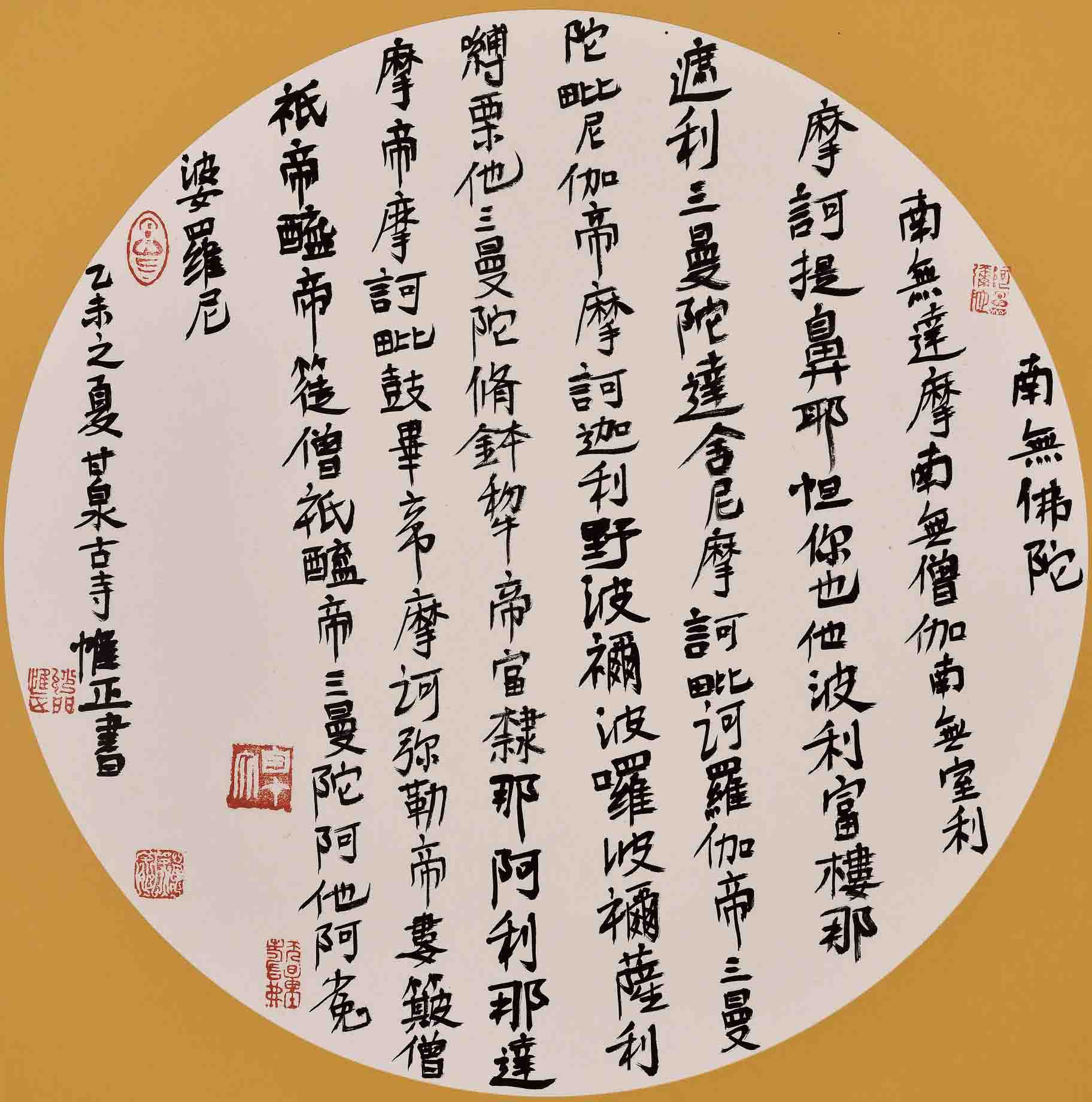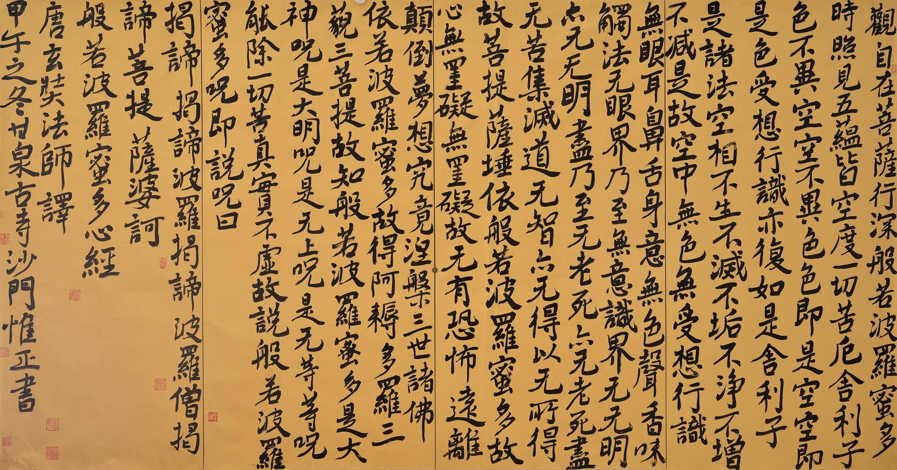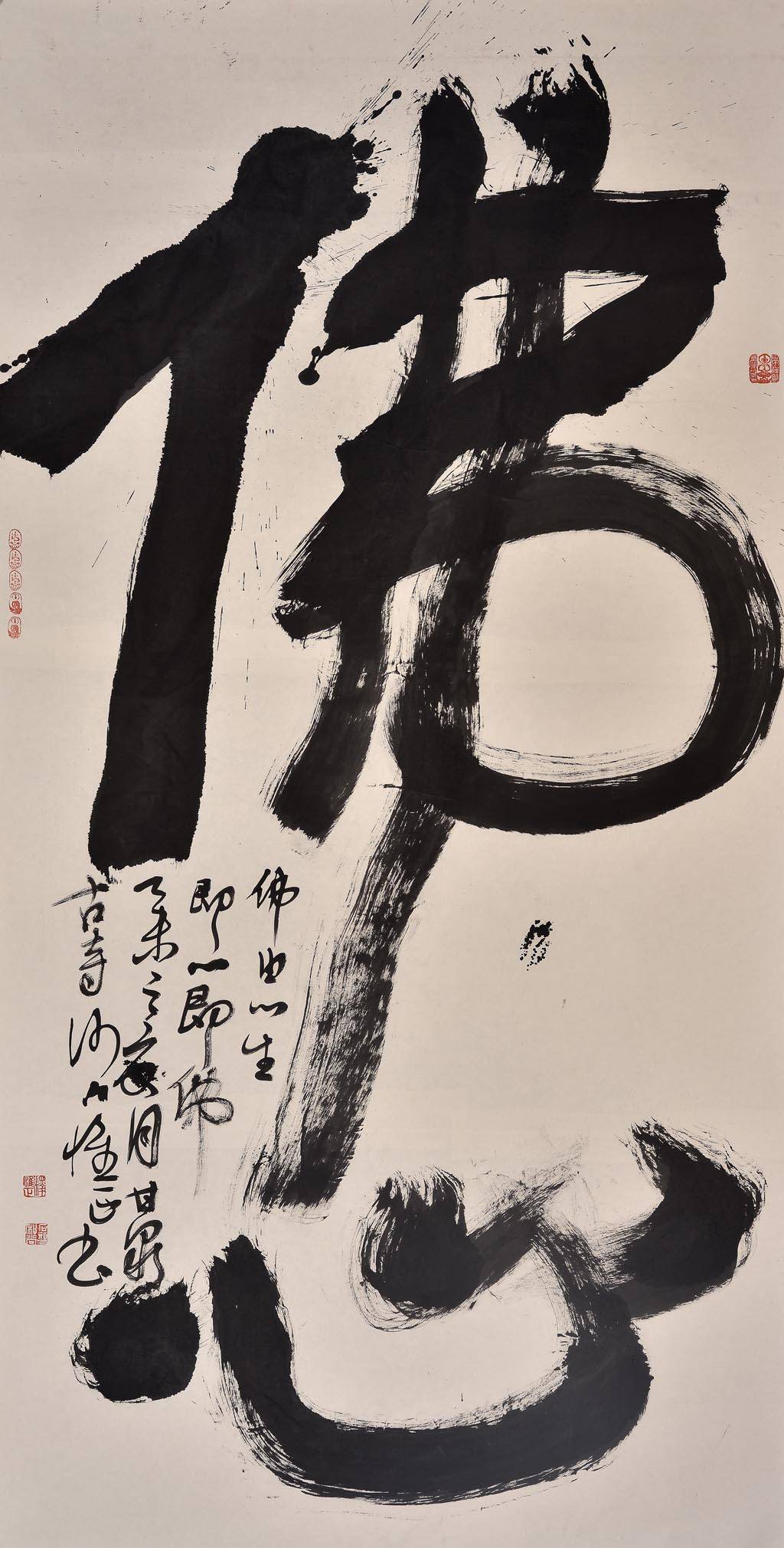 中国的传统文化,莫不受儒、释、道三者的影响。尤为关键的是,这三者影响的是文人、艺术家的精神层面。就书法来讲,在技法过关的前提下,想要写出有境界、有内涵、有个性、感动人的作品,没有此三者(或其中之一)的修为是不可想象的。与惟正和尚相处如沐春风,他面带微笑,举止雍容大度,从容不迫;惟正和尚对于佛法精研甚深,谈吐间对于佛法经典信手拈来,既能感到随性亲和,不胜欢喜,又如聆妙语,无上清凉;惟正和尚主持甘泉禅寺以来,广结庙宇,弘法众生,寺院香火空前旺盛,影响日隆。