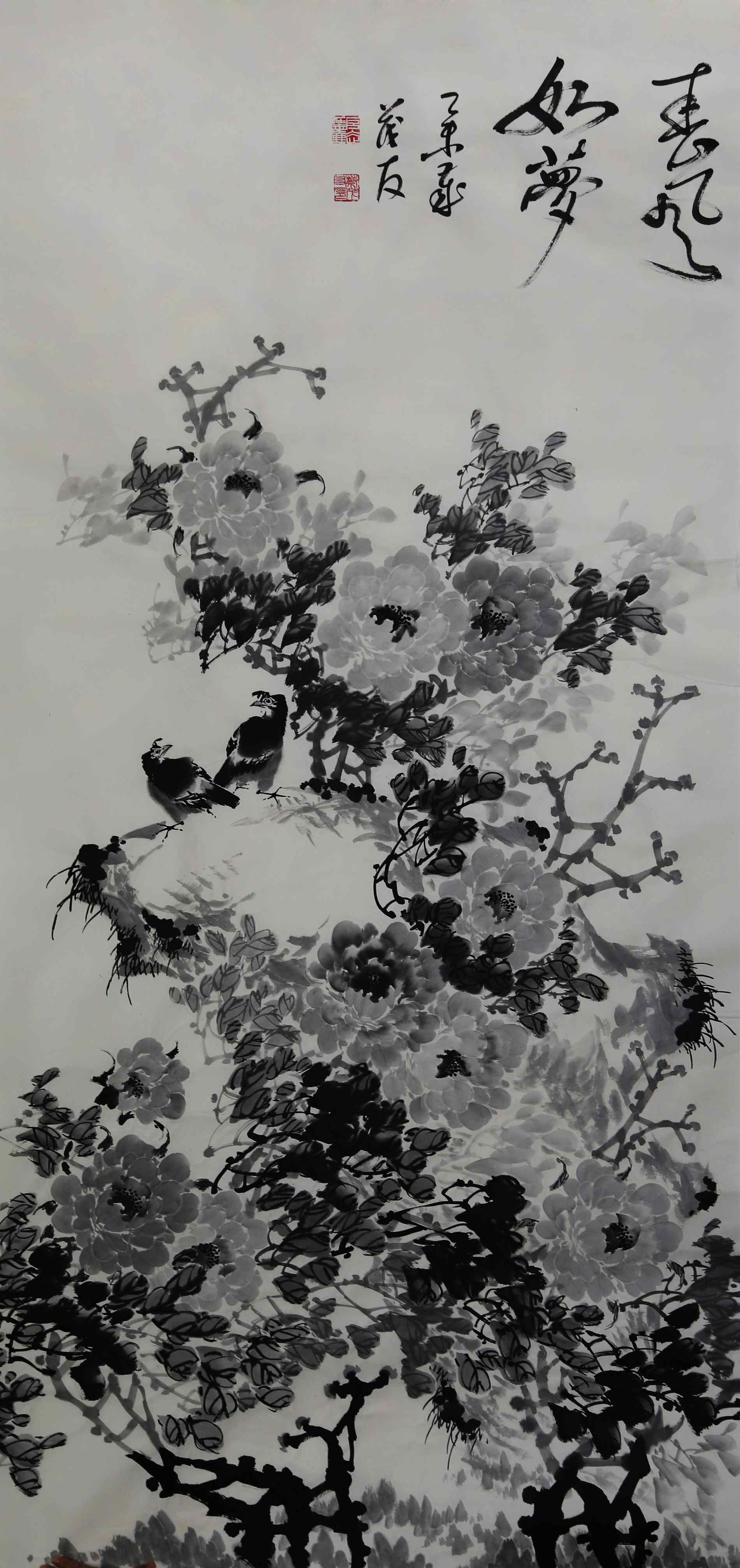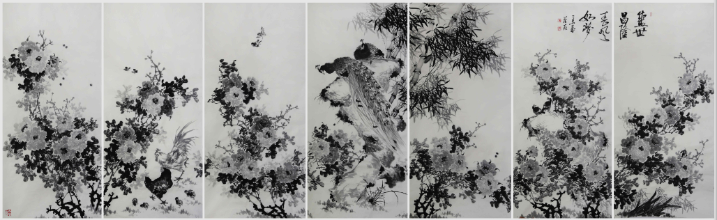 欣赏蔡茂友水墨牡丹,涉及到作品本体的各个层面,诸如笔法、色彩、布局,墨法、意象、情态、风格等等,都应纳入欣赏的视野。正如:国色天香,赏之欢乐。画家绘就牡丹的过程,即是赏花、写心的过程,若非心神合一、人花合一,则是徒劳。神韵是中国水墨画中极其重要的内涵因素,它决定着一幅作品品格的优劣与高下。神韵的形成,是画家心灵在深刻关照自然、关照生命之后,自身精神品格的物化过程,是主、客体的综合统一,也是画家个人禀性、才情、学养及其际遇的集中体现。蔡茂友近期所创作的水墨牡丹七条屏《盛世昌隆 春风如梦》,就是这样一幅神韵生动的作品。画家把这种境界绘就在作品,并由作品传达给观众,在潜移默化中使人的性灵得到陶冶和升华,在不知不觉中进入神圣而又纯净的境界,仿佛找到了一方恬静的心灵绿洲,呼吸到美的气息,增添了无限生活乐趣。