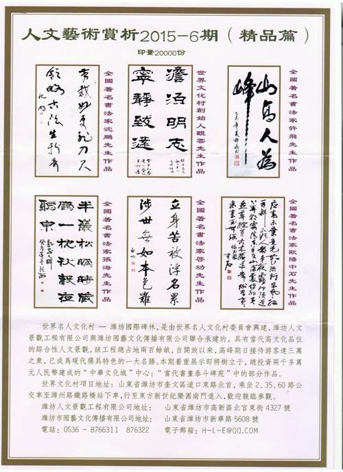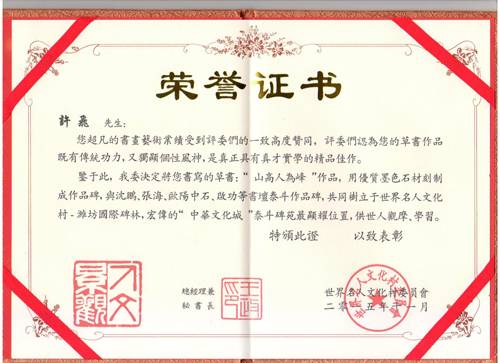许飞书法作品《山高人为峰》入选世界名人文化村----國際碑林荣誉证书