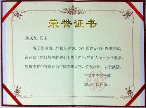 祝贺陶关绥被评为中共中宣部杰出人物!