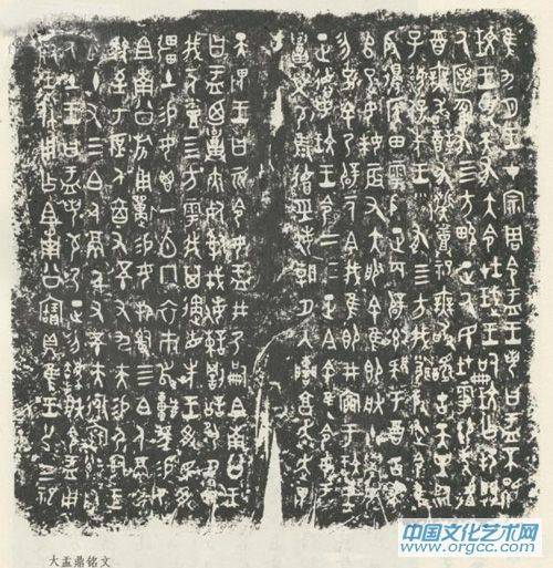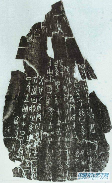 篆书分大篆、小篆两种。一般以秦为界,秦统一文字以前的文字统称大篆,此后的篆书称为小篆。大篆又分为“甲骨文”(图三)——指刻在龟甲、牛肩胛骨上用来卜卦的文字,应用在商代;“金文”(图四)——指刻在金属器皿(多是青铜器)上的文字,始于商代,应用重点在周代;“石鼓文”(图五)——东周时期刻在十个石鼓上的文字,因历史上欧阳修、赵明诚等史学家推断其作者是周宣王太史籀(zhòu)所写,又被称为“籀文”。