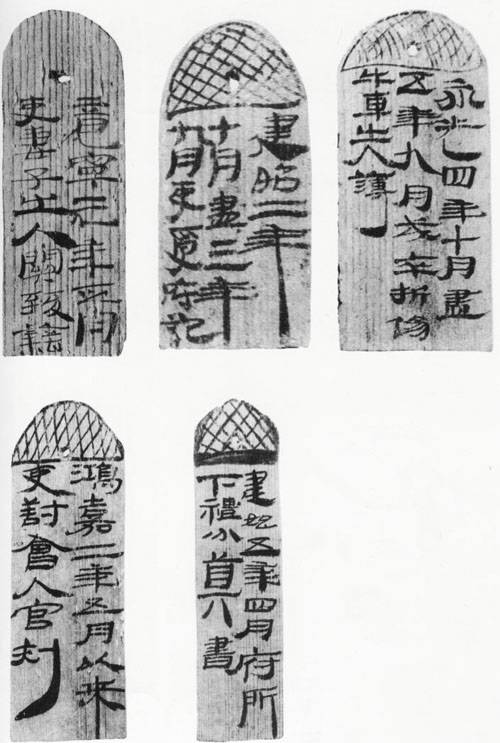 在章草产生的同时,楷书也应运而生。据《晋书·卫桓传》所载,汉灵帝(公元168——184)时,“上谷王次仲始作楷书”。目前所能见到的楷书范本,最早的当属汉末钟繇的了(图三)。楷书出现之后,又以楷书为基础产生了新的草书“今草”,也即后人说的“狂草”,张芝是这方面的大家(图四)。从出土的二万多片西汉初年的居延简书(图五)、银雀山简书来看,篆、隶、楷、行、草诸体皆备,说明各种书体产生到成熟,都是经过数百年社会实践应用,相互影响,增减补删,渐渐形成独立个性,从而成为成熟书体。