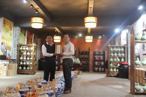许飞与广州品之味酒业老总姜杰(中)等合影