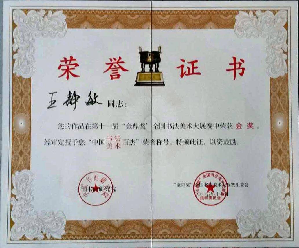 祝贺王静敏荣获第十一届金鼎奖全国书法美术大展赛金奖