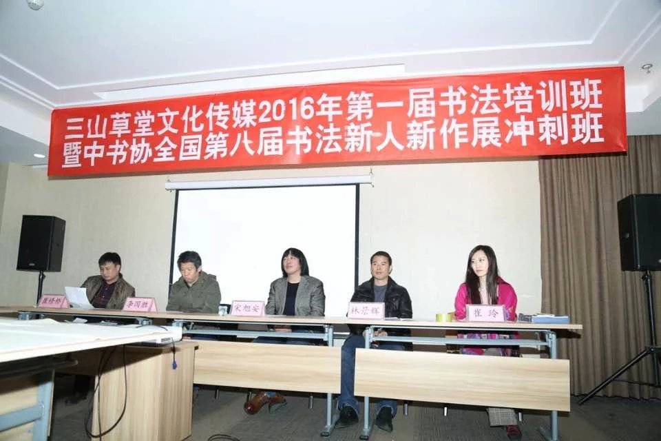 2016年1月20日,三山草堂文化传媒2016年第一届书法培训班暨中书协全国第八届书法新人新作展冲刺班在山东青岛市黄岛区尚客优宾馆举行。此次开班仪式由三山草堂文化传媒副总经理孙忠主持,中国书法家协会楷书专业委员会书委员当代著名中青年书法家宋旭安、当代著名中青年书法家李国胜、当代著名中青年书法家林景辉、三山草堂文化传媒总经理崔修桥、副总经理崔玲以及来自全国各地30多名学员参加了此次开班仪式。