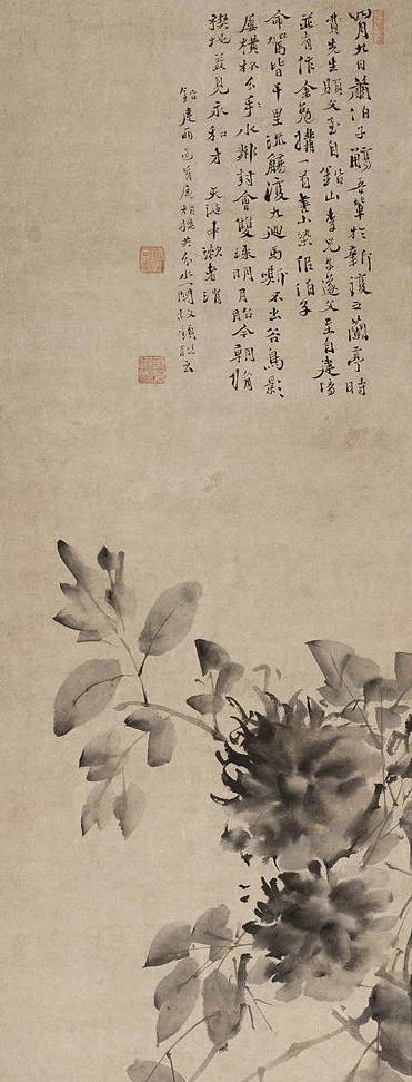 研究中国水墨牡丹,徐渭是一座绕不开的高峰。徐渭画牡丹,不用色彩,仅以泼墨为之,并题《墨牡丹》云:“牡丹为富贵花,主光彩夺目,故昔人多以钩染烘托见长。今以泼墨为之,虽有生意,终不是此花真面目。”他是我国大写意画的宗师,影响及于八大山人、石涛、扬州八怪直至吴昌硕、齐白石,在美术史上有着很高的地位。他用笔放纵,水墨淋漓,气格刚健而风韵妩媚,具有诗一般的抒情性和韵律感,极为人们所珍视。