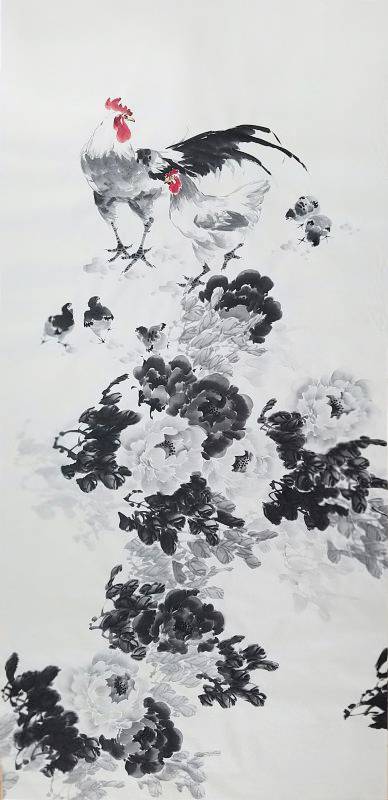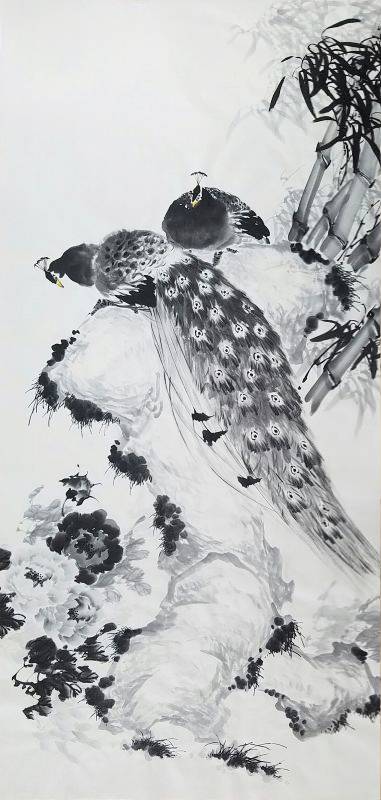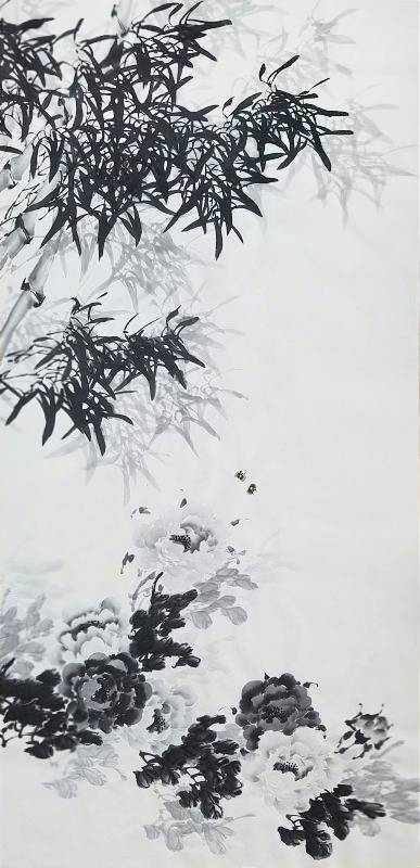 蔡茂友画水墨牡丹始终遵从一条他自己提出的艺术原则,便是其所取法的艺术形象——自然生长的牡丹。譬如,他画牡丹题云:“春光美”,以春为题,添以孔雀、顽石、蜜蜂、雄鸡、竹、仙鹤等等伴之水墨牡丹入画,他的牡丹繁密的枝叶也常作迎风摆动、向左右下方摇荡的姿态。并擅以构图技巧来强调花头如歌若舞的态势,连叶子的翻转、枝干的穿插、植物与动物之间的互相顾盼都具有传情达意的妙用。故而他的牡丹不仅光彩照人,而且意象清新,意境优美,可观可赏。当中仍来自他精湛的笔法意境,为欣赏者营造出一片开阔的审美天地。