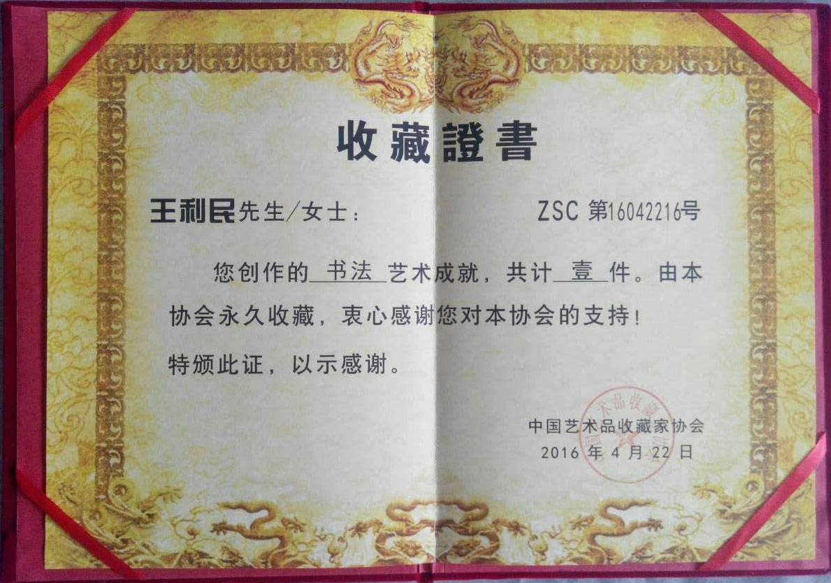 书法家王利民艺术品收藏证书