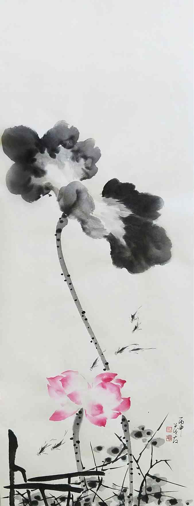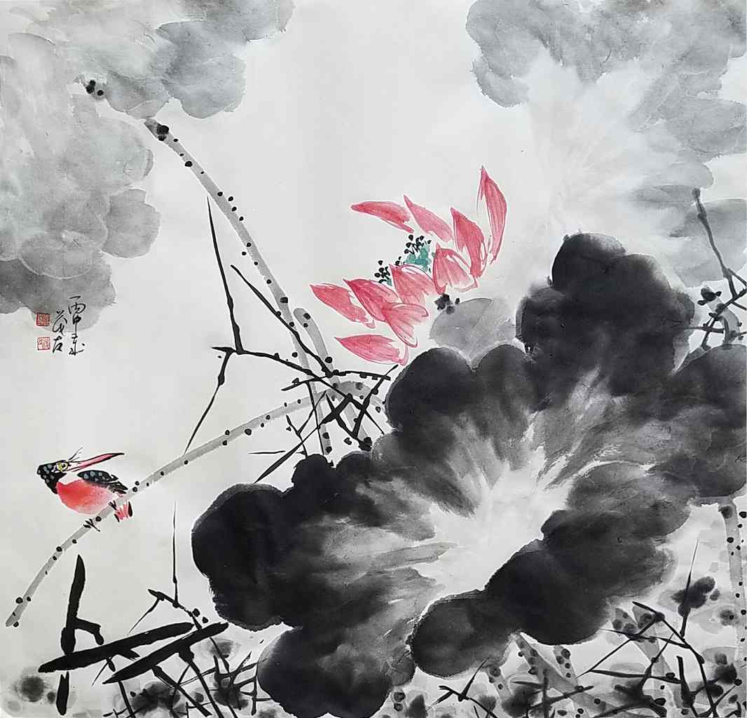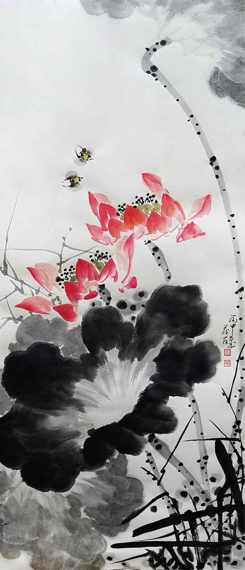 写意画的笔墨既有象物的效能,又有传情的功用,为了表现个性的鲜明、抒发感受的强烈,甚至于可以夸张变形。蔡茂友不但在继承传统水墨画特性,而且按照自己的艺术个性强化了笔墨节奏,极尽轻重、浓淡、干湿、虚实对比之妙。在洁白宣纸上,画家心境如“清水出芙蓉,天然去雕饰”,荷花清香远溢,那出淤泥而不染的品性更是映衬了文人墨客追求的精神世界。在蔡茂友的水墨荷花新作中,我们看到以“出淤泥而不染,濯清莲而不妖”的荷花为主题,花朵多姿多态,枝叶带露,娉婷舒展,俯仰欹侧;两只蜜蜂翩翩起舞,一翠鸟戏水悠然,打破了一池碧水的宁静;鱼群正隐伏于荷叶下,躬身欲出,动态如生,平添些许生机与意趣。在画家笔下似乎都充满了灵性,构想变幻合宜。