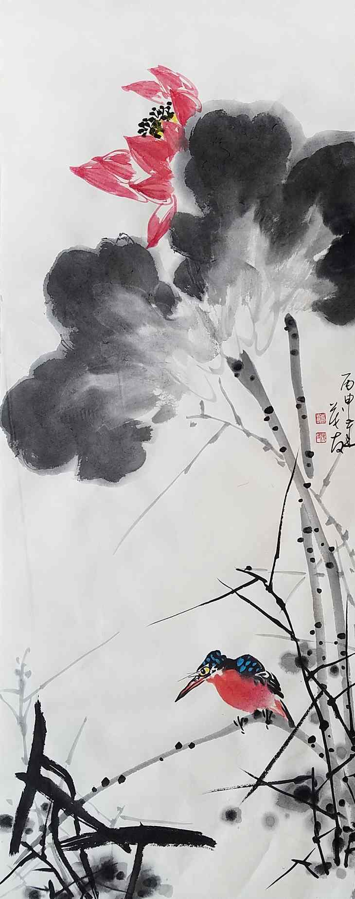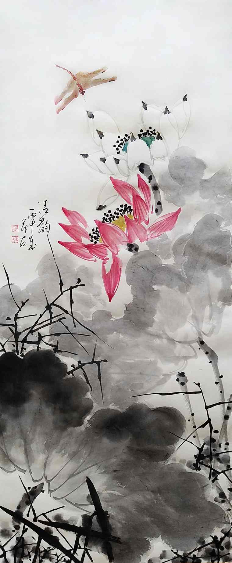 一枝清荷、几棵水草、一只蜻蜓、三两蜂鸟……并将这些与所表现的事物的形神有机地结合起来,做到心手相应,气力相合,迹虽断而气连,笔不周而意周。再论说荷之境界,也即诗境,不染尘是要求要纯净,没有一点污点,是一种单纯的美、纯净的一种美,也可以说是清净。再看他的作品《清韵》里看到晨曦,在《听荷》里听到了鸟的啾鸣。也许他以这种笔墨抒写了自己的情意,也许通过这画面所移情与附加了许多我们的生活与文化记忆。