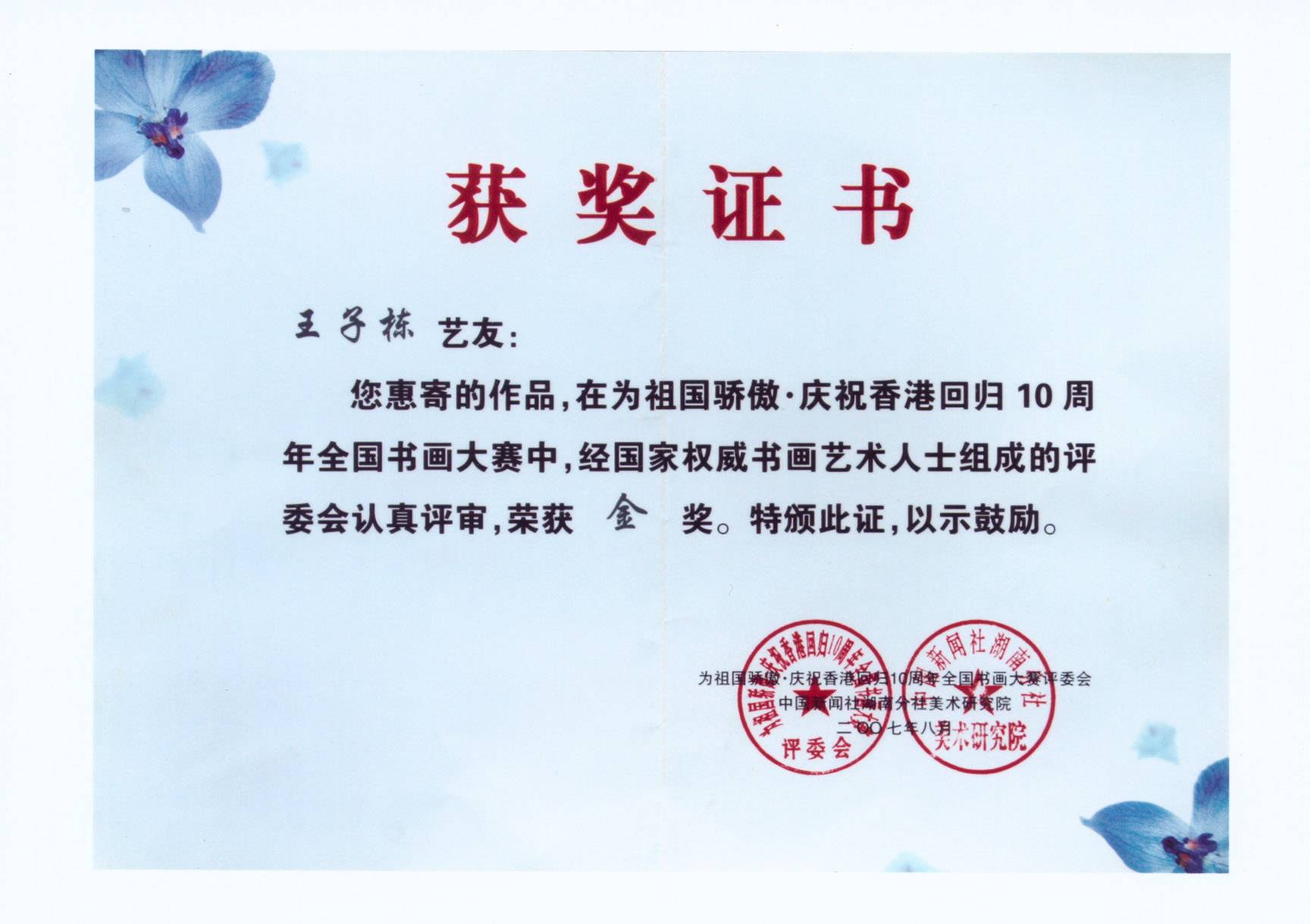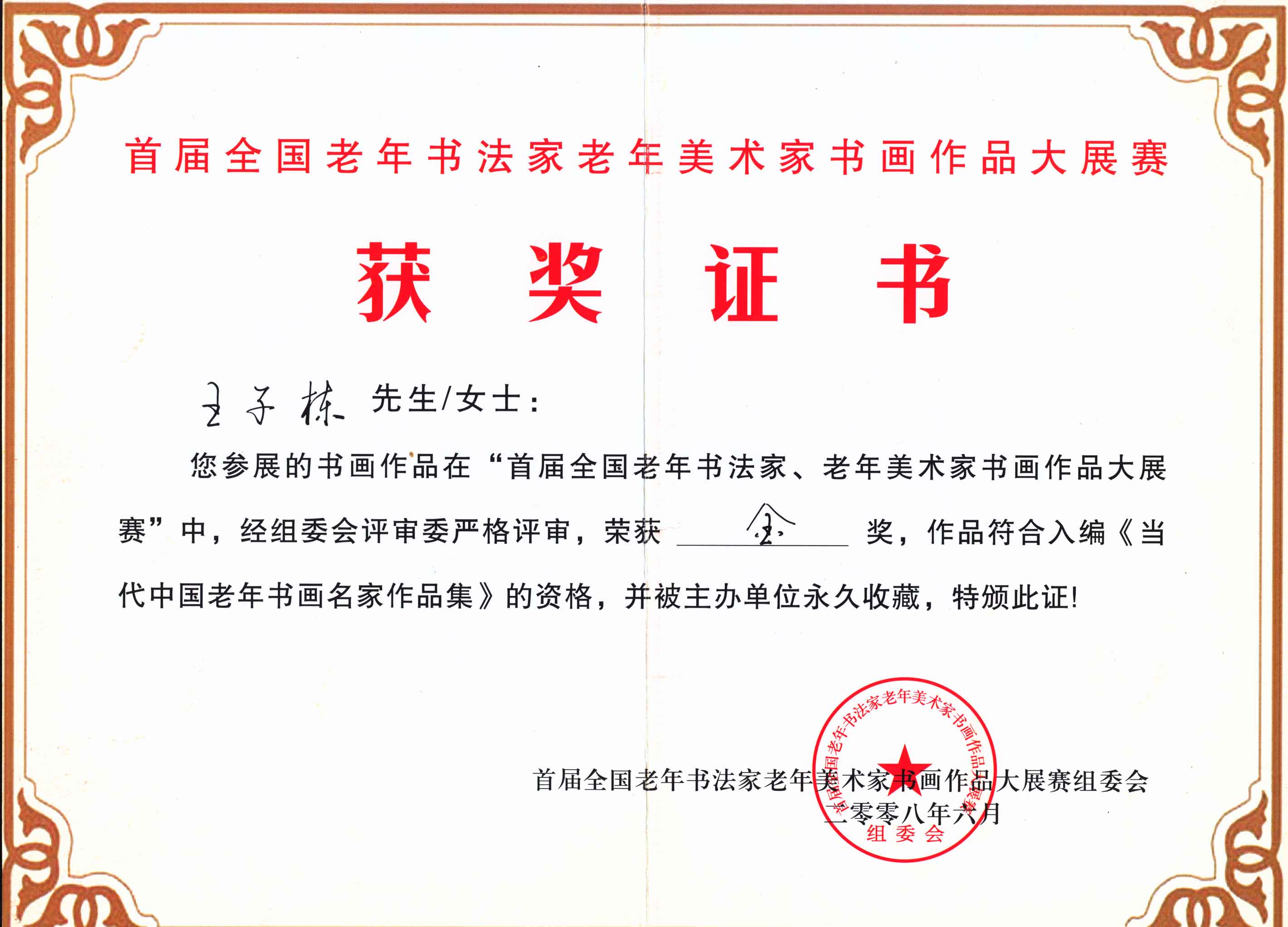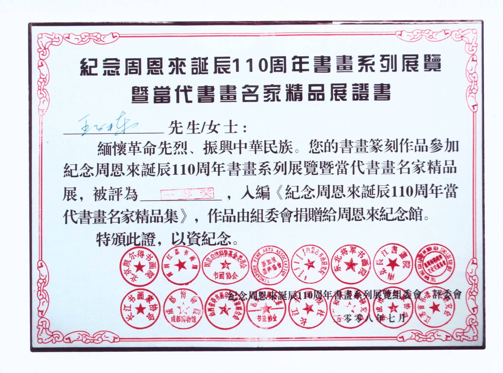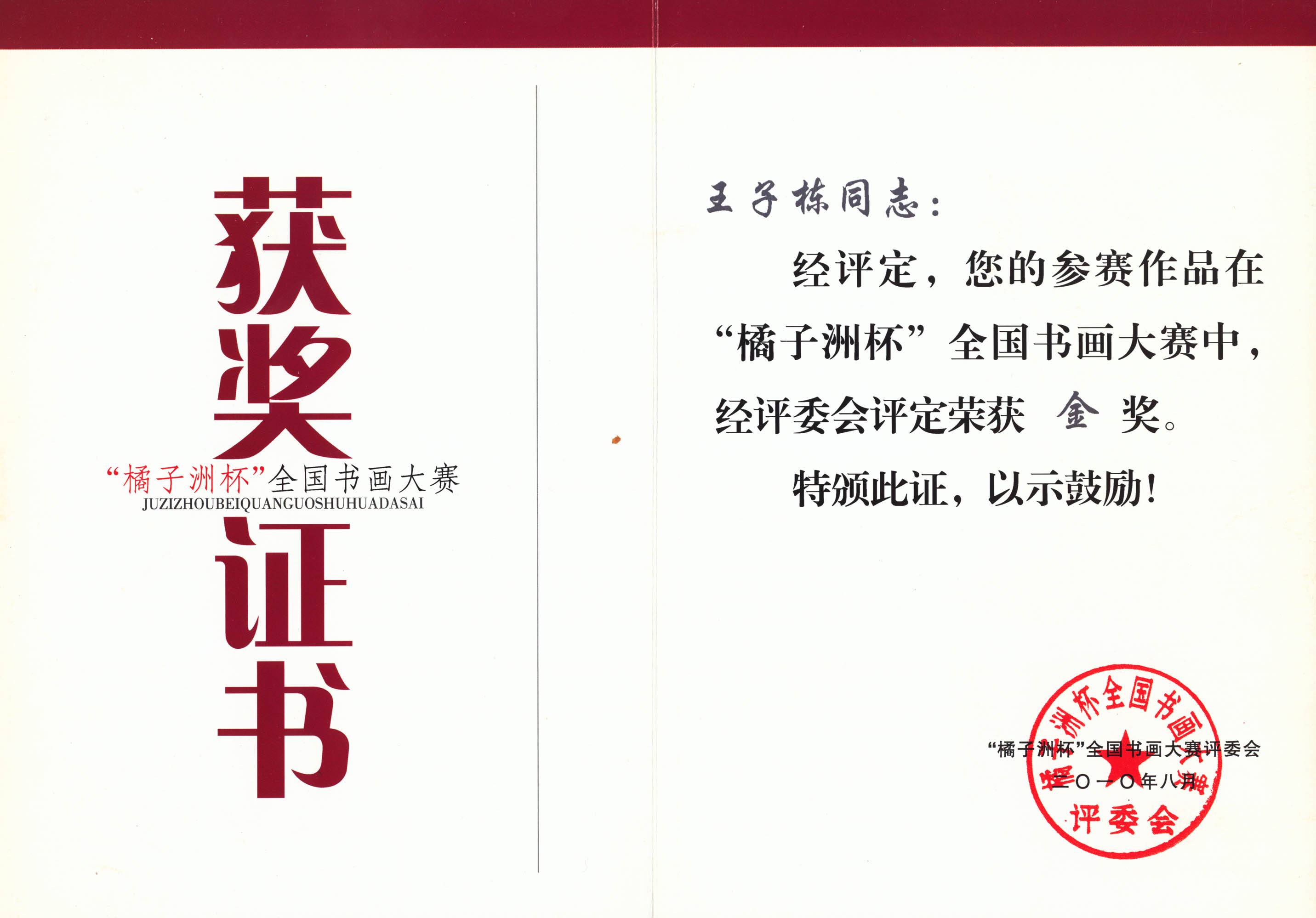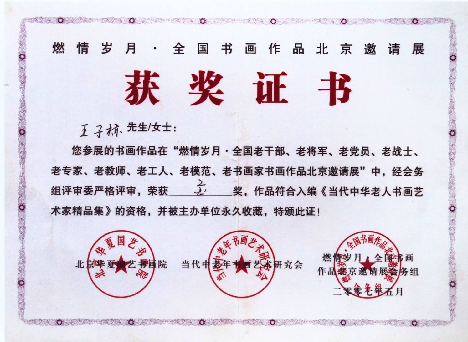 著名书法艺术家王子栋先生获奖证书展示系列一