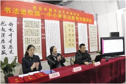 2016年12月10日下午,西安中国书法艺术博物馆在举办的 “中小学生书法教育”专题讲座上,听取了中国书法家协会理事、教育部艺术学教学指导委员,北京师范大学艺术与传媒学院书法系教授倪文东,中国书法教育联盟主席赵九江等两位书法教育界专家带来的生动、深刻、富有教育意义的书法教育讲座——《中小学书法教育的思路和方法》《中小学生书法教育的前景》。在场的学生和家长表示受益匪浅。