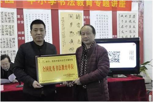 赵九江主席向书法博物馆馆长庞任隆颁发 “全国优秀书法教育单位” 铜牌